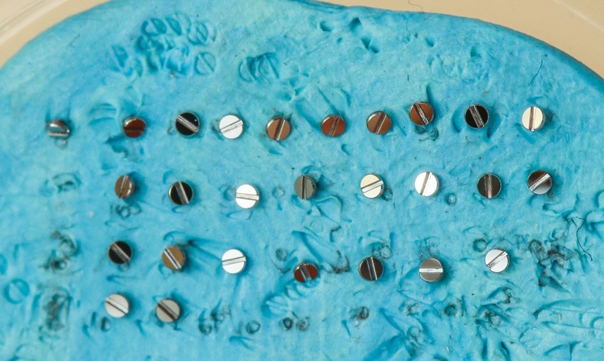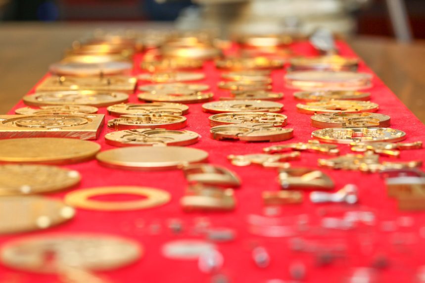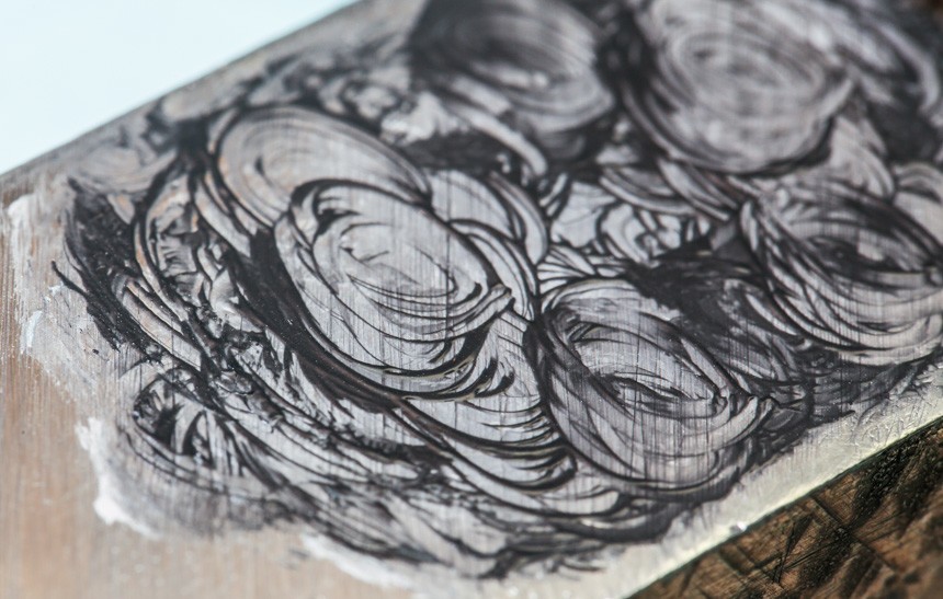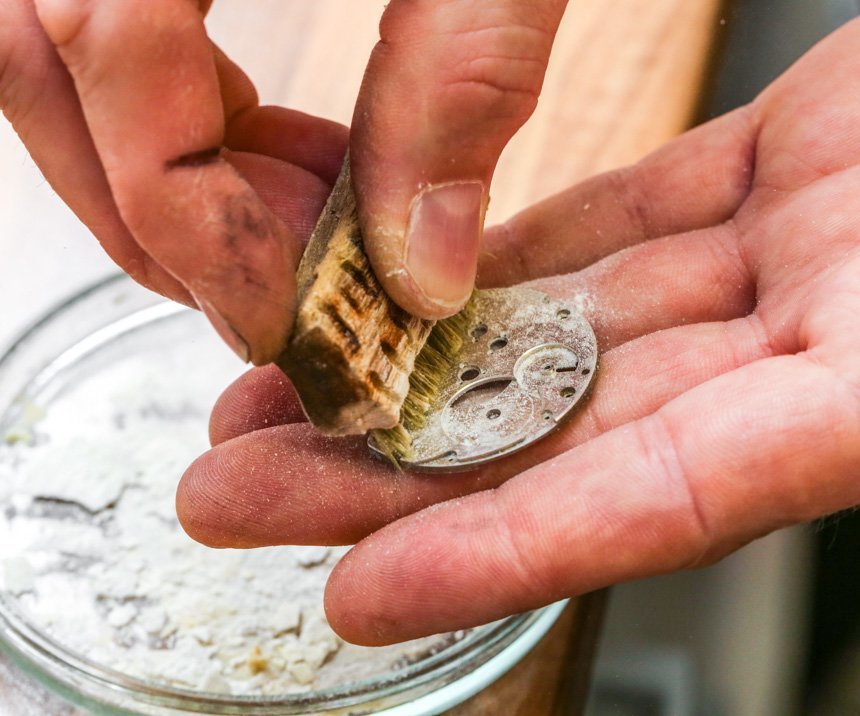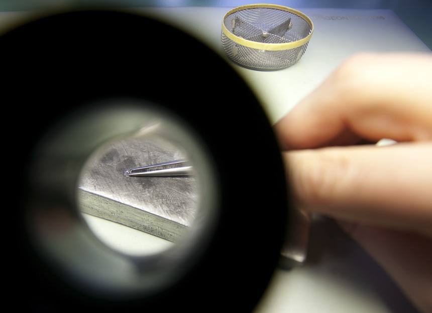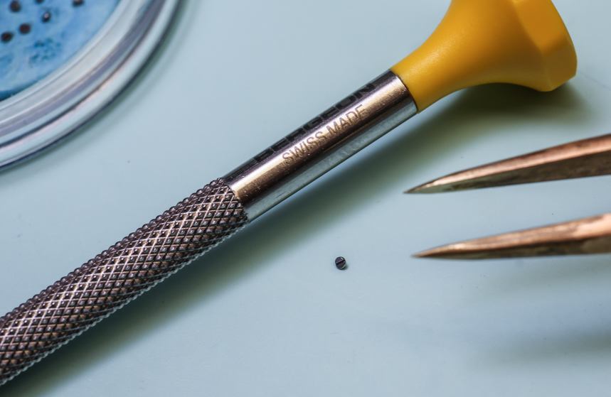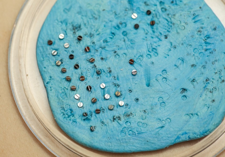 我正在看著一位年輕的制表師在一塊錫板上拉東西。是的,舊的“罐頭金屬”顯然是理想的底座,上面涂上一層薄薄的金剛石膏以“黑色拋光”螺絲的尖端。當(dāng)我盯著一個小盤子時,一顆螺絲被小心翼翼地滑過錫棒的表面并拉動,藍(lán)色的粘性材料上鑲嵌著閃亮的金屬片,幾乎在任何制表師的辦公桌上都能找到這種材料。在膩子的藍(lán)色“無劃痕區(qū)”中,是一系列經(jīng)過精心加工的成品螺絲。