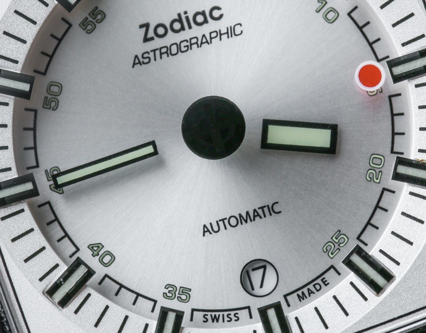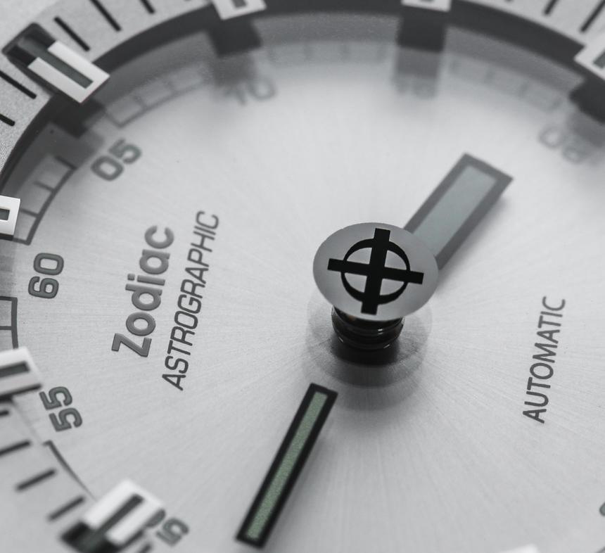 即使指針漂浮在空中,時針和分針以及涂有夜光體的時標仍然清晰易讀。這意味著在黑暗中具有良好的易讀性。我認為 Zodiac Astrographic 表盤的巧妙之處在于提供了一個明顯是“神秘表盤”的獨特設計,但提供了人們對日常佩戴的運動型手表所期望的可讀性。Zodiac Astrographic 的各種表盤版本中的每一個都會稍微改變指針和面部的顏色。我發現他們都很容易相處,但喜歡這個特別的 Zodiac Astrographic ref。ZO6601 銀色表盤與表殼相得益彰。