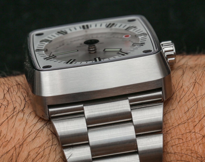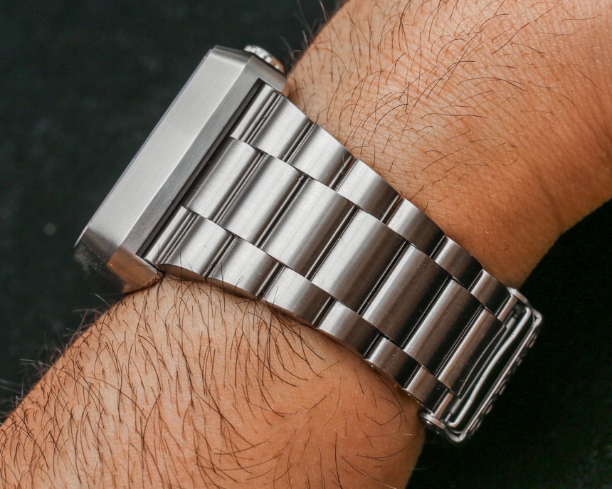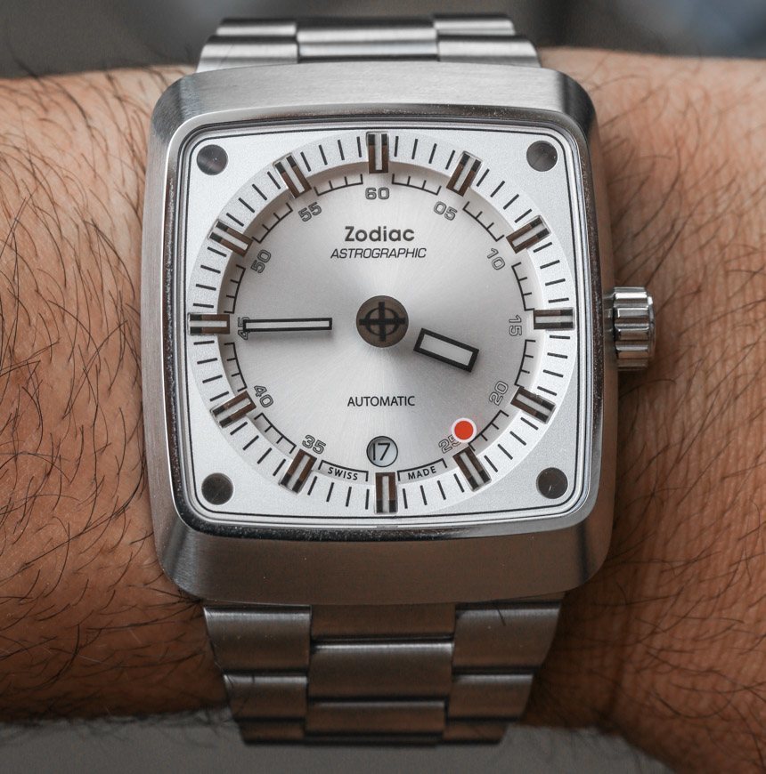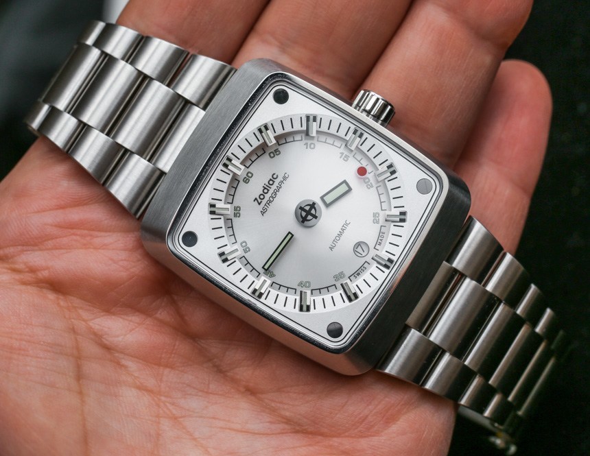 戴在手腕上,十二生肖星象表不是小表,而是佩戴舒適。“垂直電視屏幕”樣式的外殼寬 39 毫米,高 45 毫米。表殼也有 12 毫米厚——但視覺上看起來更厚一些。鋼制表殼和表鏈也很有分量——由厚鋼鏈制成。我一直是錐形手鐲的粉絲,我贊賞 Zodiac 保留了 Zodiac Astrographic 風格的這一重要元素——這也有助于佩戴舒適。那些尋求不太保守但又讓人一眼就熟悉的設計的人會喜歡 Zodiac Astrographic,其核心主題和概念出奇地經久不衰。