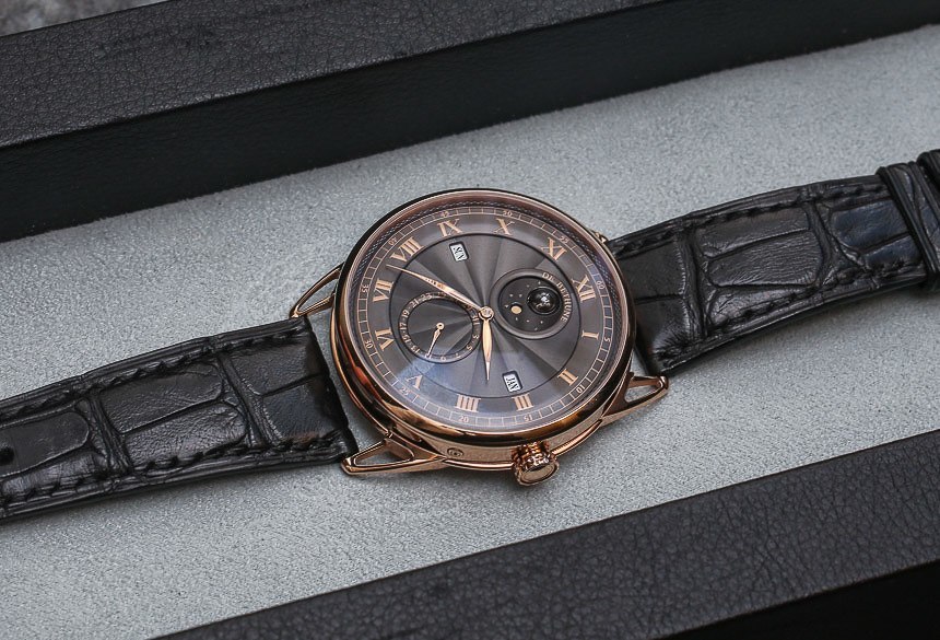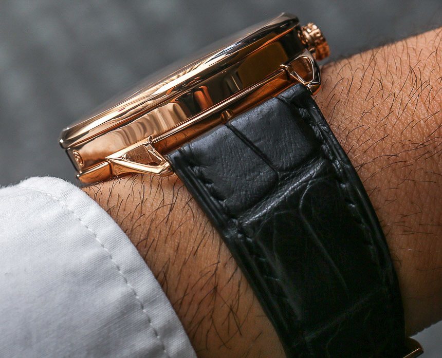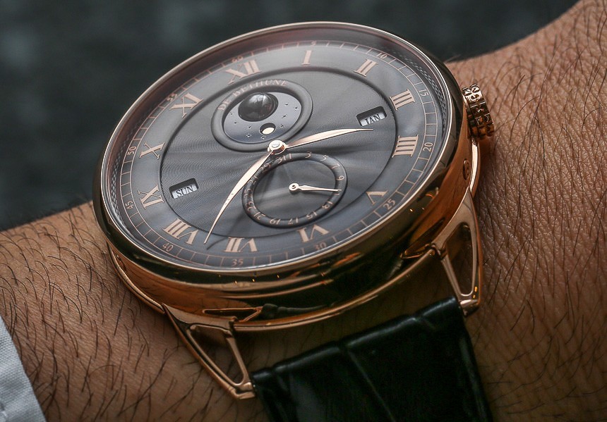 在 De Bethune DB25QP Perpetual Calendar 腕表的表盤上,您可以看到一個非常受古代琺瑯表盤懷表啟發(fā)的表盤,具有不同的層次和圓形表面。這與您從 De Bethune 看到的真正的鐘表復(fù)古設(shè)計差不多。我喜歡的是他們對這個表盤的處理也很現(xiàn)代,而且非常清晰。De Bethune 在發(fā)布新手表之前進行的大量調(diào)整是此過程的一部分,以幫助確保所有紋理和飾面都正確無誤。例如,即使表盤上的指針經(jīng)過拋光處理,它們也不會以有時讓人難以辨認(rèn)的方式反射光線。另外,請注意指針是如何向下彎曲到表盤的?這是另一個受古典啟發(fā)的細節(jié),是適當(dāng)易讀性的一部分。