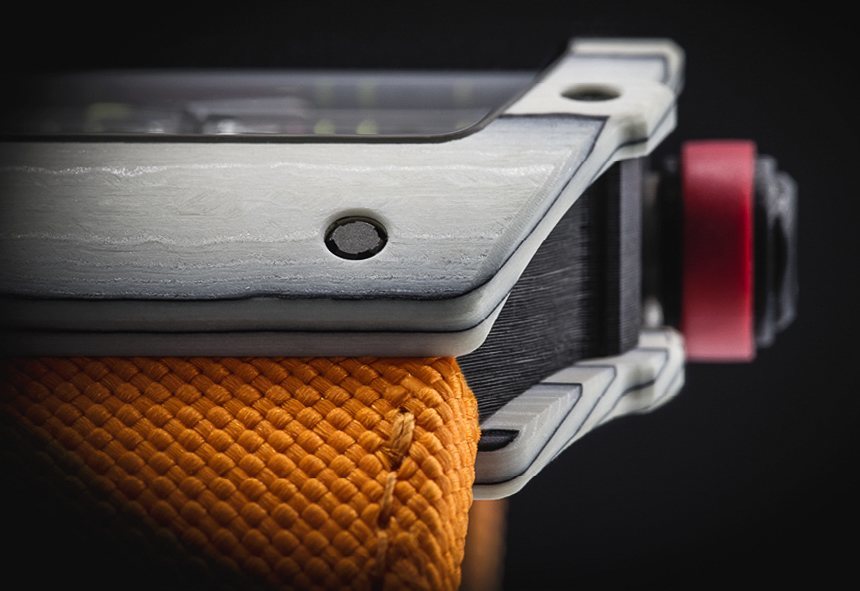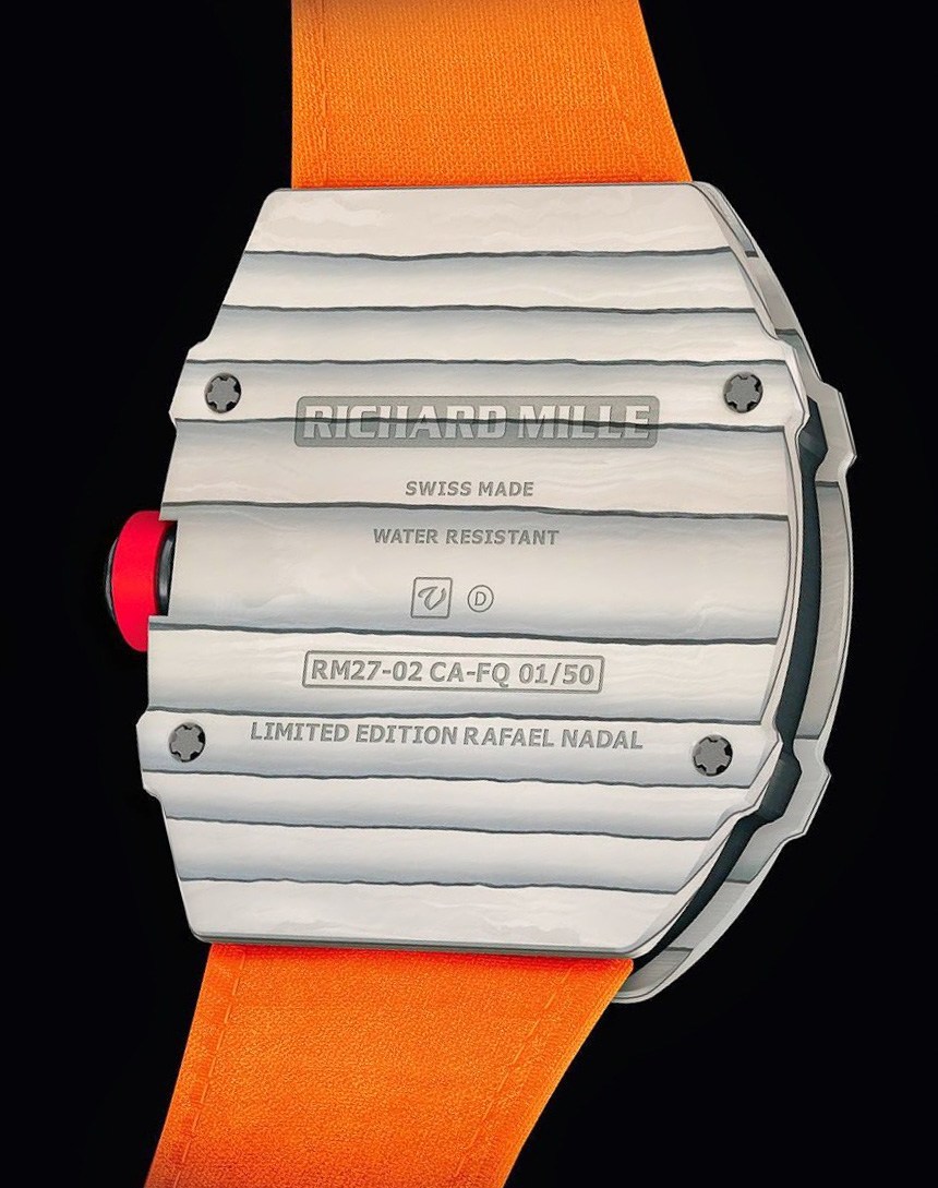 Richard Mille RM27-02 Rafael Nadal 手表同時(shí)使用碳纖維和新型石英絲材料,這兩種材料均由瑞士 NTPT(North Thin Ply Technology)創(chuàng)造。這些材料是 NTPT 為高性能賽車和工業(yè)用途生產(chǎn)的材料的改良形式。這些石英和碳材料旨在非常輕便且非常堅(jiān)固,同時(shí)還能抵抗一系列環(huán)境危害,進(jìn)一步設(shè)計(jì)時(shí)考慮到了 Richard Mille 的表面“視覺效果”。