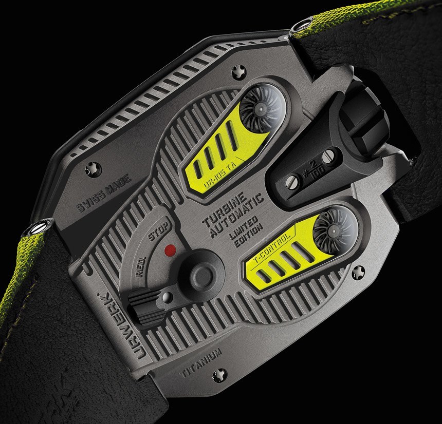 為什么是“渦輪自動”?好吧,大多數 Urwerk 自動手表都有一個擺動轉子,它連接到一組渦輪機,這些渦輪機在視覺上與轉子一起旋轉。其中一部分只是為了娛樂和表演,但它也是一個系統的一部分,該系統允許轉子輕松旋轉,阻力更大,或者一起停止旋轉(當您期待 Urwerk UR-105 TA 手表時體驗“劇烈運動”和潛在的沖擊)。Urwerk UR-105 TA 表殼背面有一個開關,允許佩戴者在自動上鏈模式之間進行選擇。廣告留言廣告信息結束