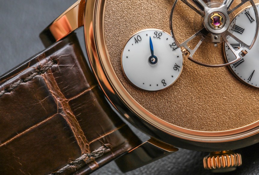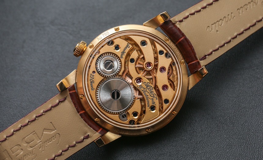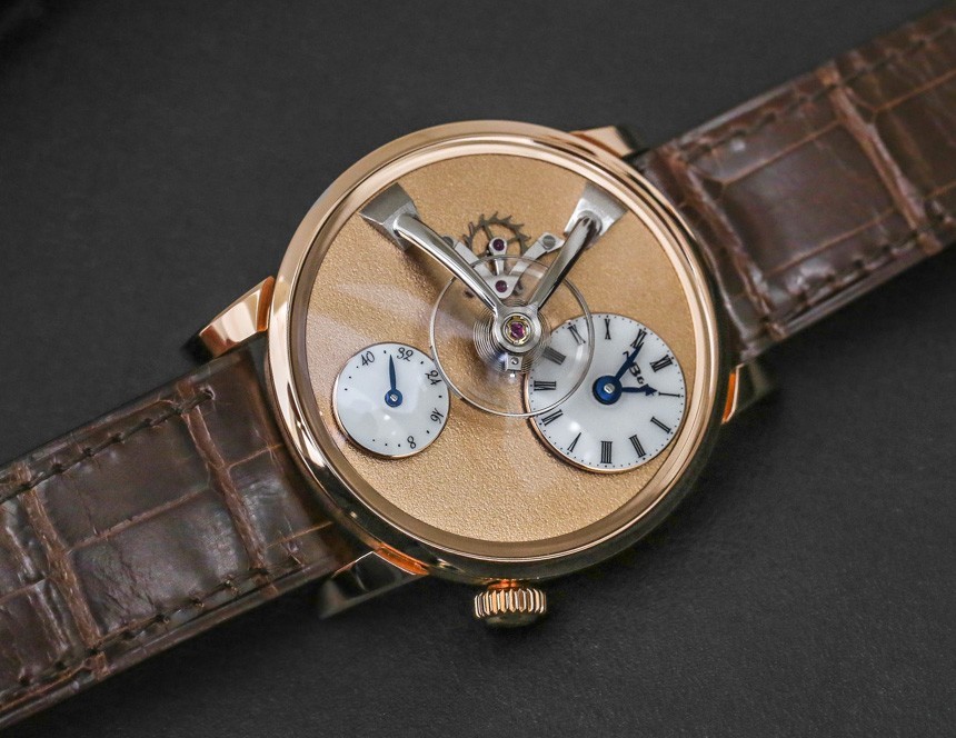 機(jī)芯以 18,000 次/小時(shí)(2.5 赫茲)的頻率運(yùn)行,表盤中央有一個(gè) 14 毫米寬的大擺輪,并通過(guò)高架橋固定在主表盤上方。機(jī)芯手動(dòng)上鏈,動(dòng)力儲(chǔ)存 45 小時(shí)。手表的表面提供了很大的空間來(lái)享受磨砂表面,6 點(diǎn)鐘位置有一個(gè)動(dòng)力儲(chǔ)存指示盤以及一個(gè)偏心表盤。