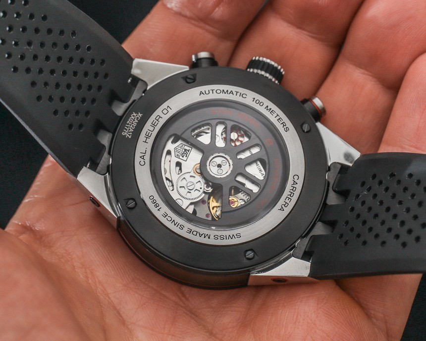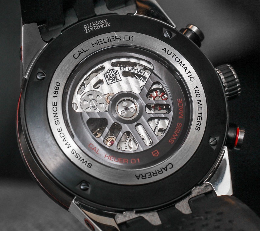 45 毫米寬的 TAG Heuer Carrera Calibre Heuer 01 手表采用黑色、鋼和紅色表殼,在圖片上看起來不像在手腕上那么漂亮。大膽的 Big Bang 風格鏤空表盤和指針看起來很酷,整體設計有趣而令人興奮,就像泰格豪雅已經有一段時間了。2015 年左右的機械表的魔力在于機械機芯,聰明的公司知道如何向愛好者展示該機芯。