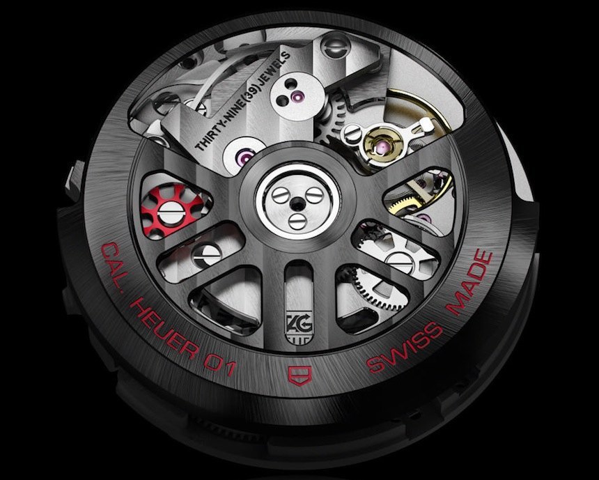 讓我們討論一下 TAG Heuer Calibre Heuer 01 機芯。你需要知道的是,從結構上看,它或多或少是一枚現有的豪雅自制calibre 1887自動計時機芯。然而,它被稍微鏤空并賦予了一些新的顏色(比如醒目的紅色導柱輪),變成了 Heuer 01。它不會取代 1887,只是在以2015 年泰格豪雅 Calibre Heuer 01 腕表。