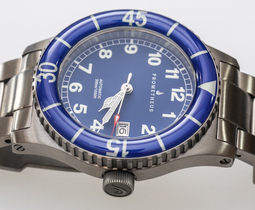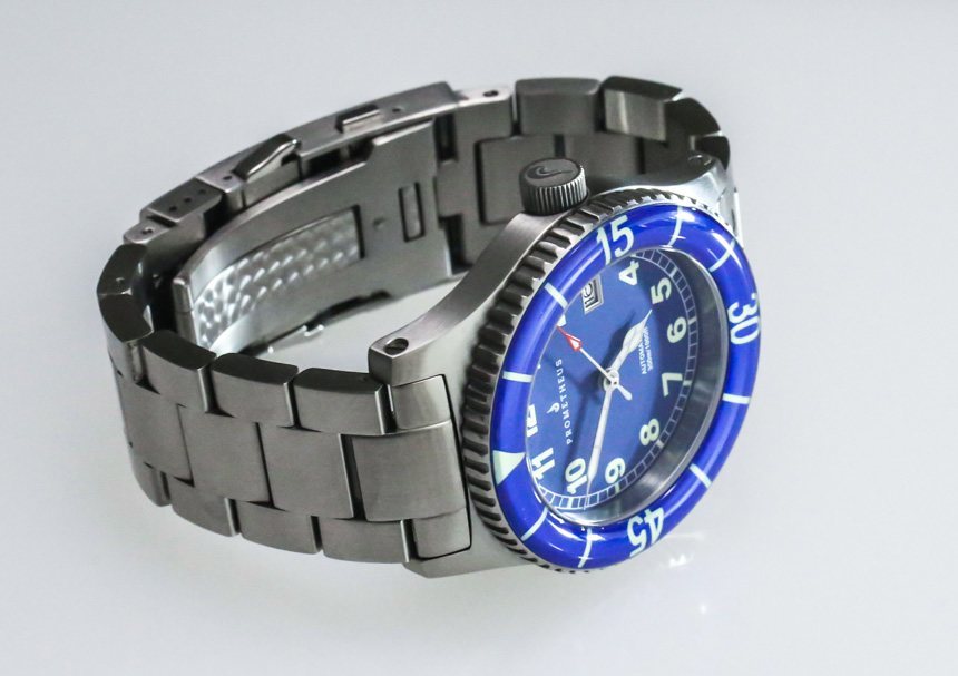 Prometheus Sailfish 寬 42 毫米,并不是一款超大手表,但由于其沉重的表殼和寬大的鋼表鏈,它確實(shí)非常耐磨。Prometheus Sailfish 表殼的主要問題是凸耳伸出的程度(表殼長(zhǎng) 52 毫米)。它們不僅間距很大,而且沒有像應(yīng)有的那樣向下彎曲。這在視覺上造成了手表的一些奇怪比例,并且從佩戴的角度來看,表殼對(duì)于小手腕和大多數(shù)中等尺寸的手腕來說會(huì)伸出太遠(yuǎn)。話雖如此,我會(huì)說手腕較大的人會(huì)覺得 Sailfish 佩戴舒適,但手腕較小的人在購(gòu)買前一定要試戴一下。