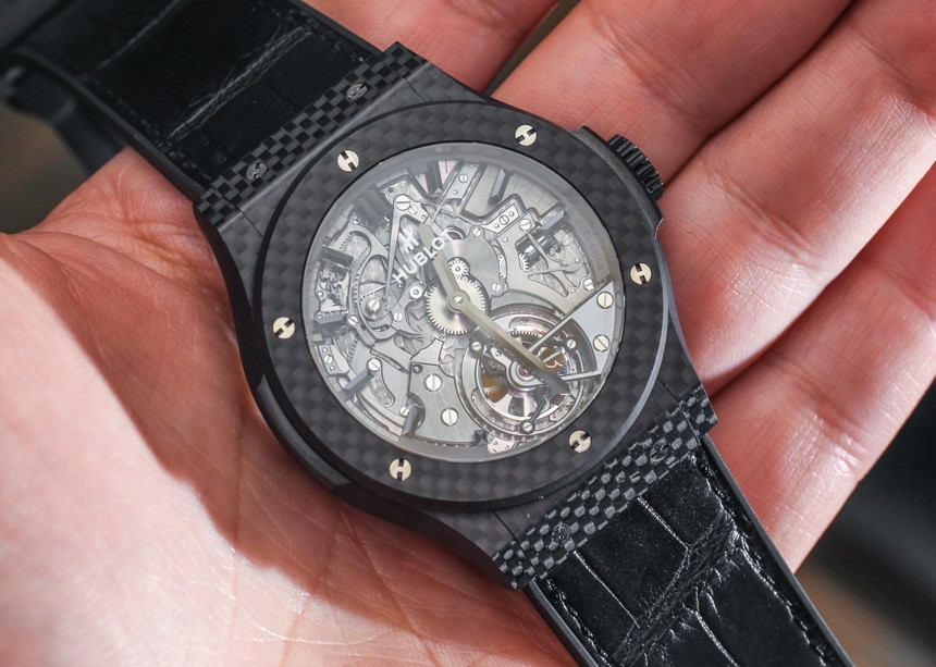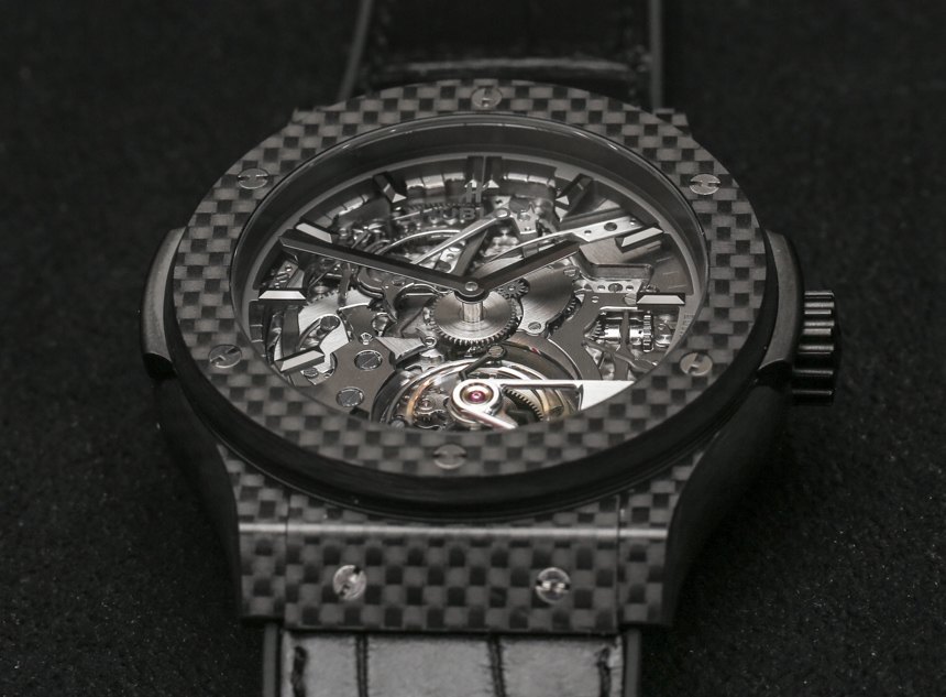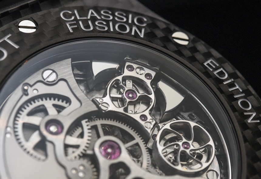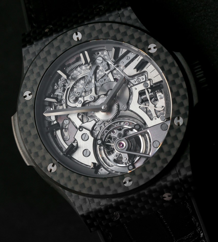 在過去的幾年里,我們看到了很多針對聲音問題的獨特解決方案,而 non 無疑是“最好的”。一些手表的音簧直接連接到藍寶石水晶上,而另一些則有特殊的共鳴室。對于 Hublot Classic Fusion Tourbillon Cathedral Minute Repeater Carbon,您有一個相對直接的解決方案,那就是使用碳纖維作為表殼材料。這實際上并不是 Hublot 第一次將三問報時器與碳纖維表殼搭配使用,但我相信之前的型號配備了 King Power 表殼和包含計時碼表的機芯。Classic Fusion 外殼在這里看起來更加優雅。