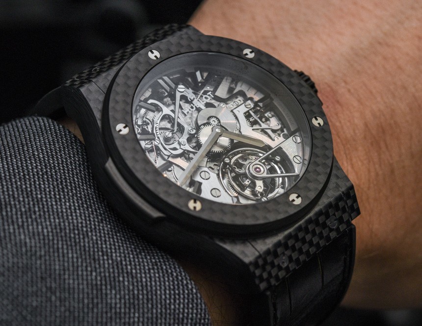 在現代碳纖維表殼中,很難預測 Hublot Classic Fusion Tourbillon Cathedral Minute Repeater Carbon 的客戶類型。一方面,您擁有高端陀飛輪三問報時機芯,另一方面,您擁有面向運動的 45 毫米寬碳纖維表殼。我想這就是我們對 Hublot 最期待的東西——跨越界限并試圖與一些興趣相交的手表。畢竟是提倡“融合的藝術”的品牌。