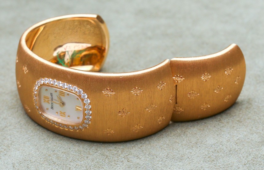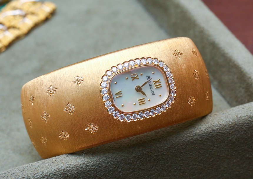 Buccellati 以一種特殊形式的黃金雕刻而聞名,他們稱之為“Rigato”。這種技術旨在使黃金表面看起來像絲綢織物。它幾乎看起來像深拉絲飾面,但不是用工具完成的,而是使用特殊工具完全手工雕刻的。Buccellati 的標志性袖口已發(fā)展成為一系列手表,通常飾有額外的雕刻和鉆石。實際上,找到作為袖口一部分的高端珠寶手表是獨一無二的。
