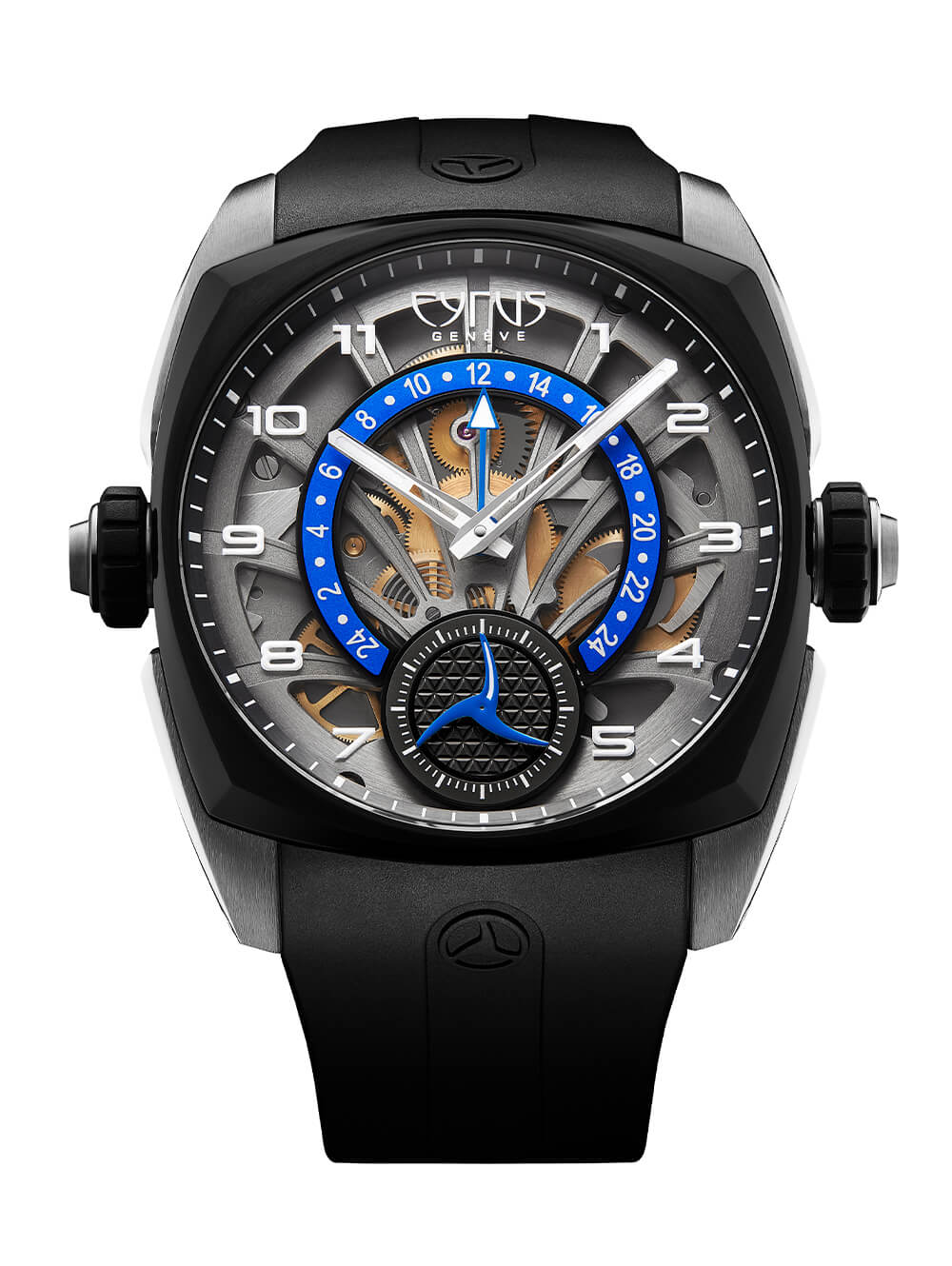 腕表中央顯示小時和分鐘,六點鐘位置設有小秒針,并以不同尋常的方式呈現 GMT 復雜功能。