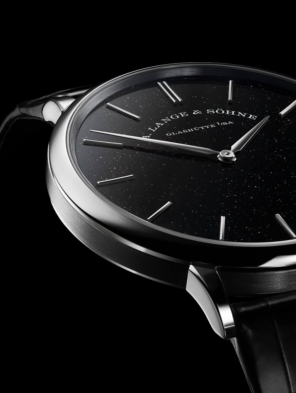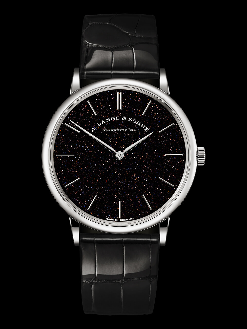 這種材料以眾多名稱而聞名,包括 Goldstone 和 Gold Flux,這是朗格自 2018 年生產首款此類表盤以來一直使用的名稱,即帶有藍色 Aventurine 表盤的 Saxonia Thin。Blue Aventurine 經常被用來制作以天文為靈感的手表的表盤,其中銅內含物與深藍色玻璃相映成趣,從而相當忠實地再現(xiàn)了夜空。