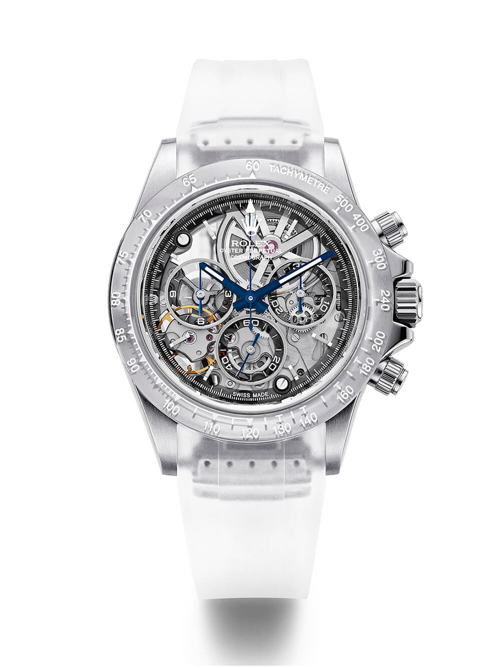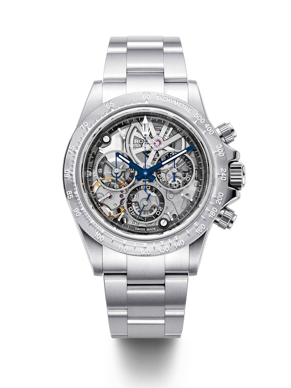 這兩個部分都是完全手工完成的,需要荒謬的工時和專業(yè)知識才能完成。更棒的是,它們呈現(xiàn)出內(nèi)部鏤空機芯的完美視圖,提供我們以前在任何勞力士從未見過的那種輕盈和透明感。配有偏光計時盤和火焰藍指針,在可讀性和鐘表暴露主義之間取得了很好的平衡。