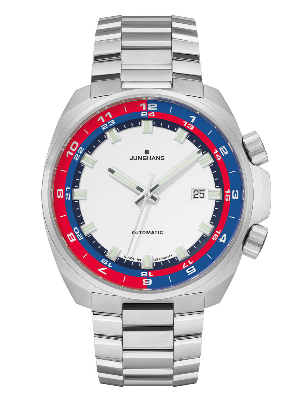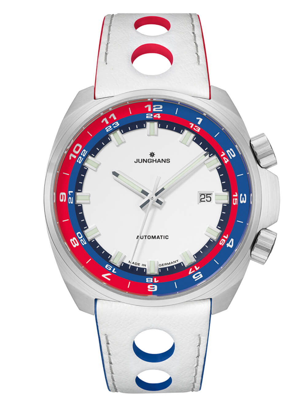 恰如其分的雪白表盤搭配亮藍色和紅色第二時區內表圈,可通過 2 點鐘位置的表冠進行操作。您可以更清楚地分辨表冠之間的區別,因為 2 點鐘位置的表冠上飾有雪花,而用于設置時間的 4 點鐘位置表冠則使用了榮漢斯星。你知道,如果他們的立場不夠容易的話。