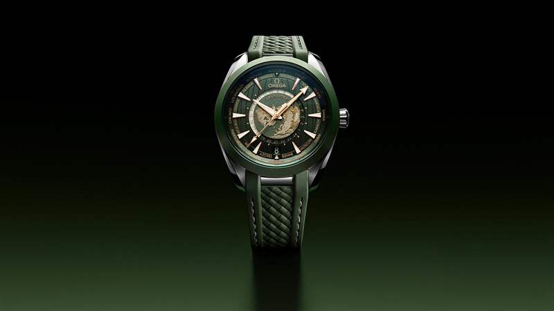 同樣出自海馬 AQUA TERRA 150米腕表系列旗下,43毫米至臻天文臺(tái) GMT 世界時(shí)腕表其不銹鋼表殼搭配一體式綠色橡膠表帶,飾以灰色縫線,通過拋光鋼鏈節(jié)與表殼連為一體。最亮眼的綠色表盤呈現(xiàn)出太陽射線的打磨效果,搭配經(jīng)過拋光和拉絲工藝處理的綠色陶瓷表圈。表盤中央設(shè)有內(nèi)表盤,以激光燒蝕技術(shù)雕刻出從北極俯瞰的地球影像陸地輪廓與色彩。內(nèi)表盤外側(cè)設(shè)有24小時(shí)刻度環(huán),并區(qū)分指示夜晚和白天。表盤周圍環(huán)繞著世界各地的不同城市,所有地區(qū)名稱均采用金黃色,而英國首都倫敦則采用紅色,對于環(huán)球的旅行家來說使用起來方便快捷。