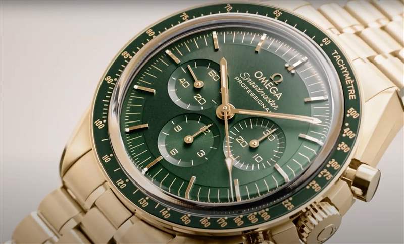 當然,對于歐米茄超霸系列來說,專業(yè)月球表代表著該系列的「靈魂」,從1969年首次登月以來,此后人類歷史上迄今為止所有的登月任務中,它都伴隨著宇航員們活動于月球之上。時近年末,超霸系列專業(yè)月球表 Moonshine 18K金款,金殼金帶其閃耀的光澤仿佛深邃夜空中的皎潔月光,尤其地高雅脫俗。這款腕表有 Moonshine 18K金表盤或經過PVD處理的綠色表盤可供選擇,不同色彩自有不同的味道。值得一提的還有全新表款所沿襲的第4代超霸登月表的設計風格,其突出的特點正是測速計刻度上呈現(xiàn)出早期超霸表款的‘Dot Over Ninety’(刻度90的圓點位于數字上方)風格,藏家與鑒賞家尤其喜歡這樣的細節(jié)。