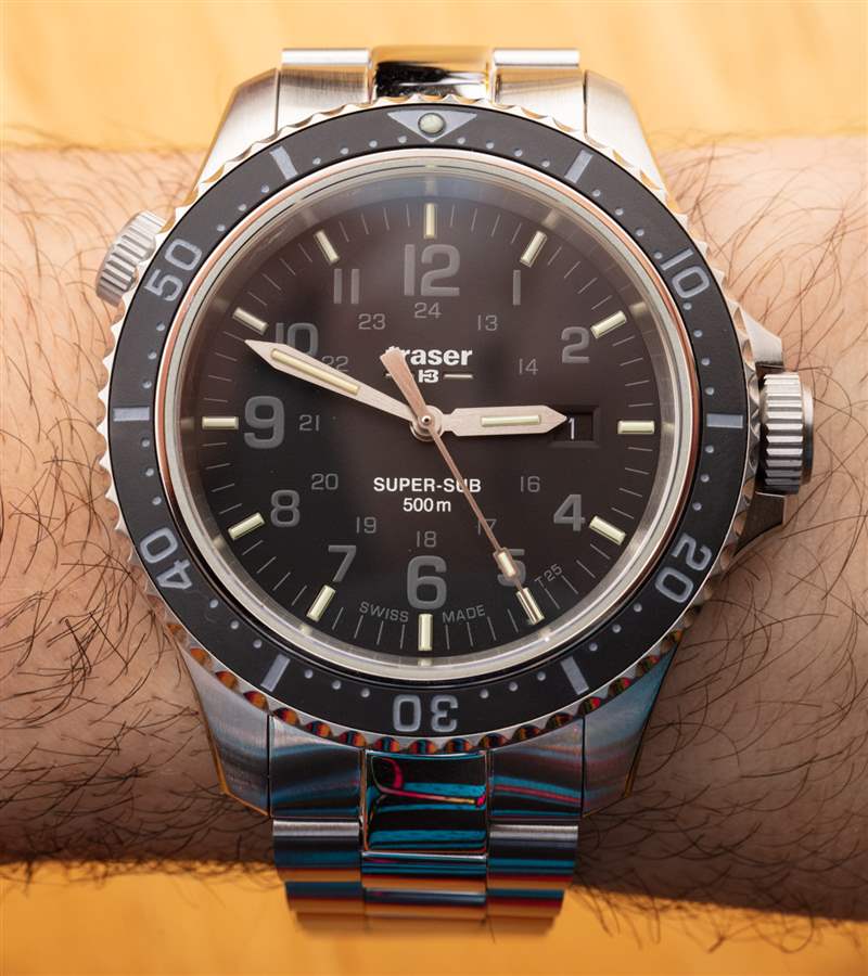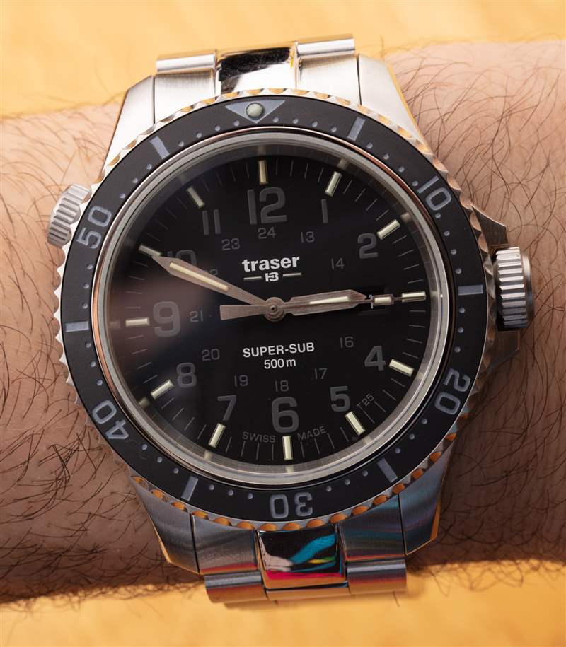 P67 SuperSub T100 型號使用較粗的扁平氣管作為時標。此處的照片代表 T25 參考 109378 P67 SuperSub 手表。確實,它在黑暗中不如 T100 型號那么亮,但在我看來,它在視覺上也更具吸引力,可以更好地日常佩戴。這是黑色表盤表款,搭配相配的精鋼表鏈。Traser 還生產帶有橙色或藍色表盤的 P67。確實,手有點短,但易讀性仍然很好。我的懷疑是由于手的重量,手的長度沒有達到應有的長度。P67 SuperSub 系列使用瑞士制造的 Ronda 石英機芯,在更傳統的機械機芯中,這種機芯的指針并沒有盡可能重。