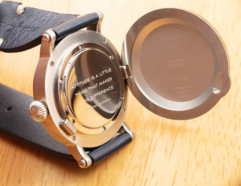表殼寬 42 毫米,凸耳到凸耳約 51 毫米,厚 13 毫米。該表殼還可以防水 50 米。關于這個案子的一個奇怪的部分是獵人風格的底蓋。這意味著有一個可以拉開的小彈簧鎖門。通常這可能會隱藏運動的窗口或其他東西……嗯,很有趣。在這種情況下,當您打開 Darkest Hour 的后蓋時,您會看到“隨機”的溫斯頓·丘吉爾名言。考慮到可用空間,這實際上可以印在最初的底蓋上。我很欣賞豪華手表中隱藏的景色,但當我打開它時會給我一些很酷的東西。要么 Stewart Dawson 需要重新考慮 Darkest Hour 手表系列的獵人底蓋部分,要么它應該考慮在你打開它后找到更誘人的東西。