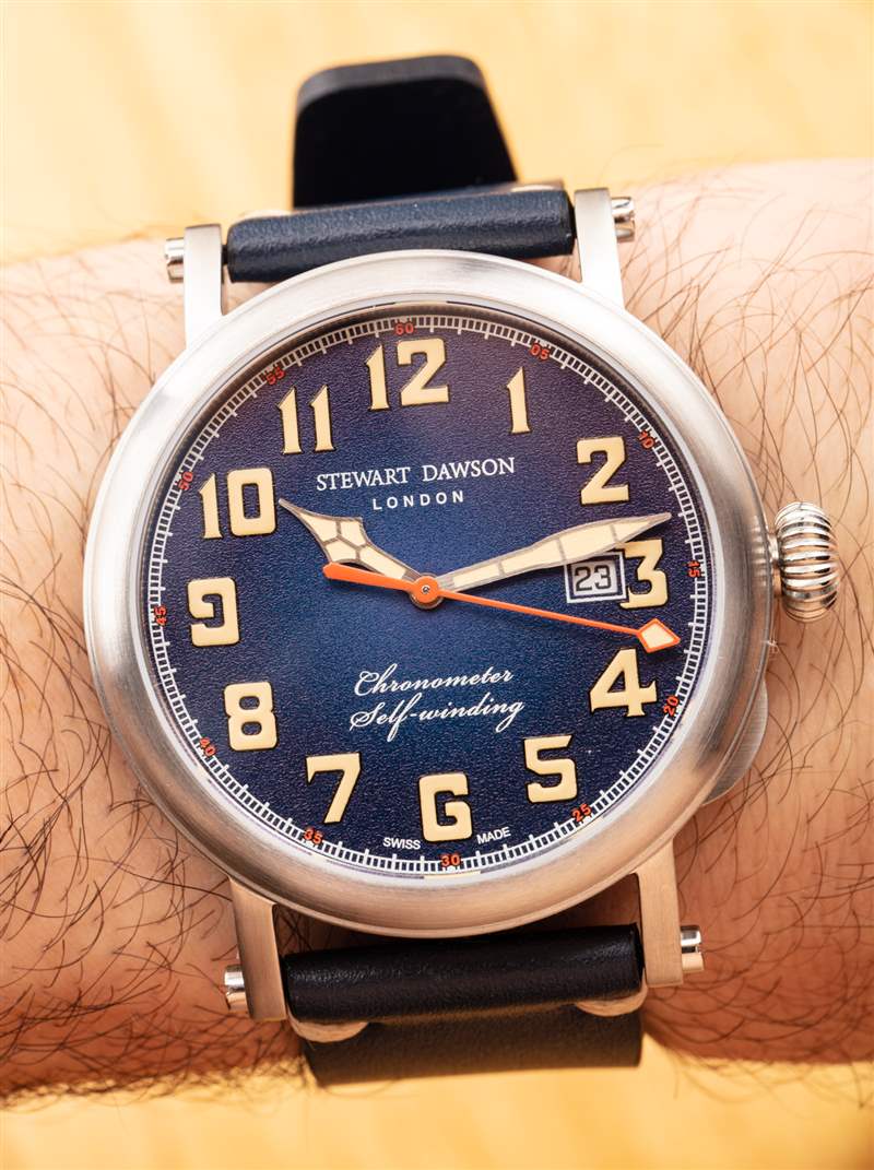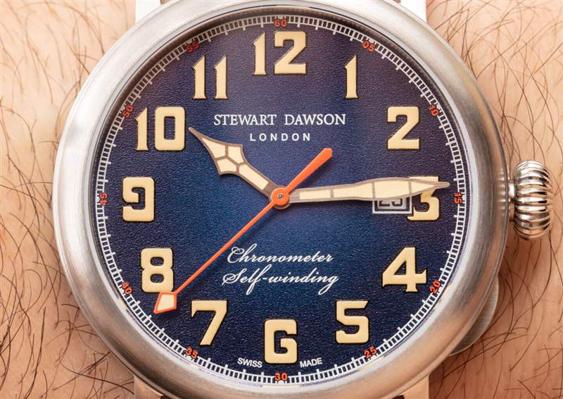 斯圖爾特道森的外觀并不太寒酸。至暗時刻共有三種表盤顏色,這是 REF。1940.A.SS.DH02 – 藍色(藍色表盤和配套表帶)。發(fā)光體涂得足夠厚,可以稍微抬高一點,顏色是一種有吸引力的“老化”奶油。它實際上比純白色更漂亮,更有吸引力。表盤上的日期窗口并沒有太大幫助,但除此之外,顏色、紋理和字體的混合對整體外觀來說效果很好。從時尚的角度來看,斯圖爾特道森獲得的不僅僅是及格分數(shù)。