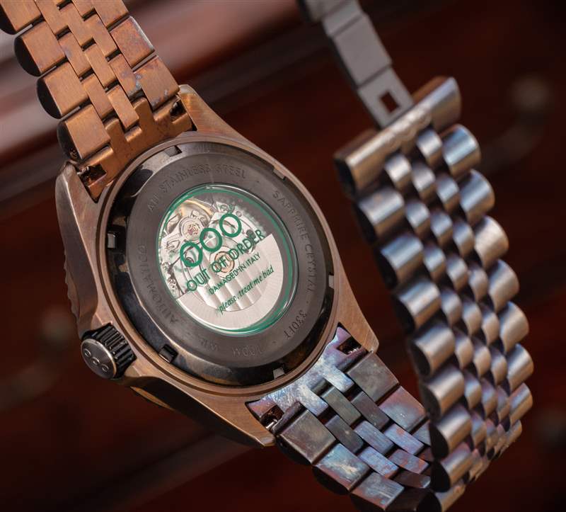 OOO Swiss Automatico 表殼為 44 毫米寬的鋼制表殼,表面經過 PVD ??著色處理,在某些地方會變色和刮掉。表盤上方是扁平藍寶石水晶。許多人會說,就老化過程而言,整體手表是意大利 Sprezzatura 時尚的一個很好的例子。這是真正的工藝,我認為如果沒有某種方法或系統,預老化效果的結果看起來不會那么有趣。這確實是一個小眾領域(但我碰巧喜歡它做得好的時候)。廣告訊息廣告信息結束