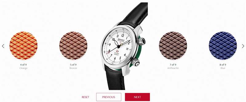 目前,Bremont 將其 MBII Configurator 體驗(yàn)設(shè)為可選,因?yàn)槟梢灾苯訌木W(wǎng)站上購買多款“預(yù)配置”MBII 手表。但是,要查看所有選項(xiàng),您需要使用配置器。