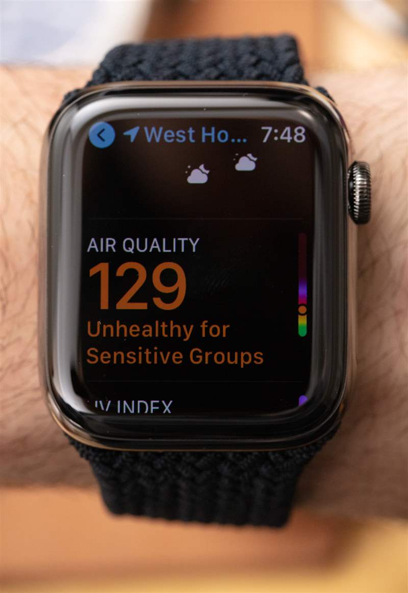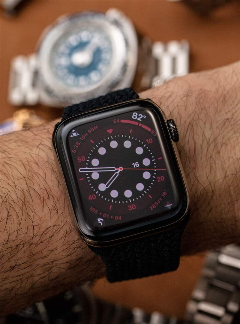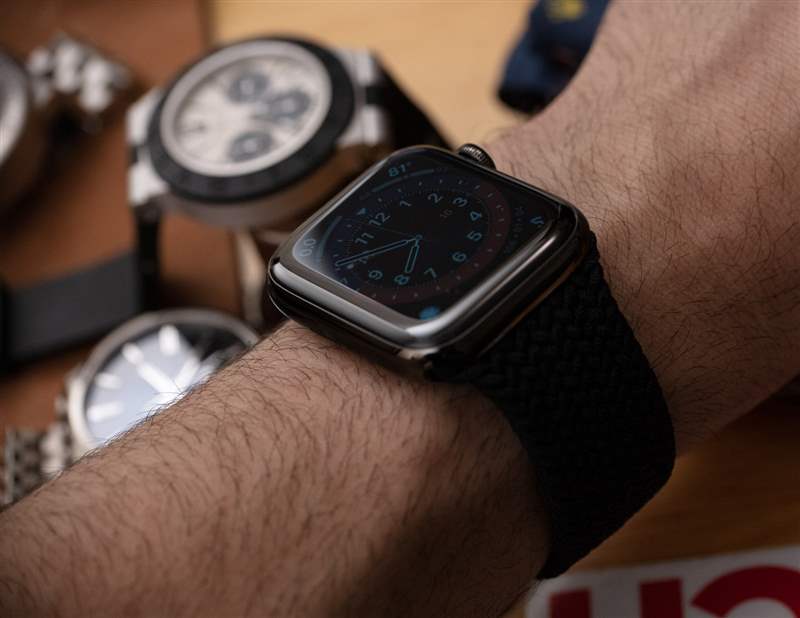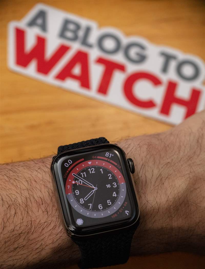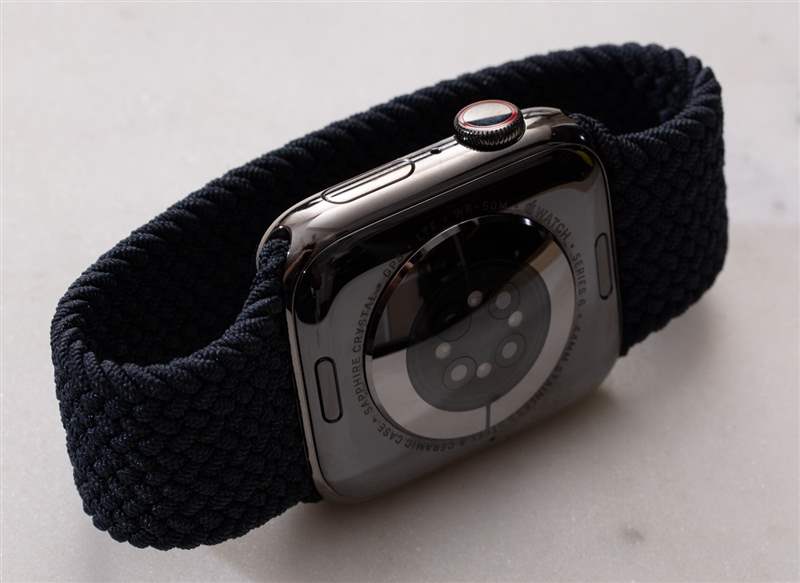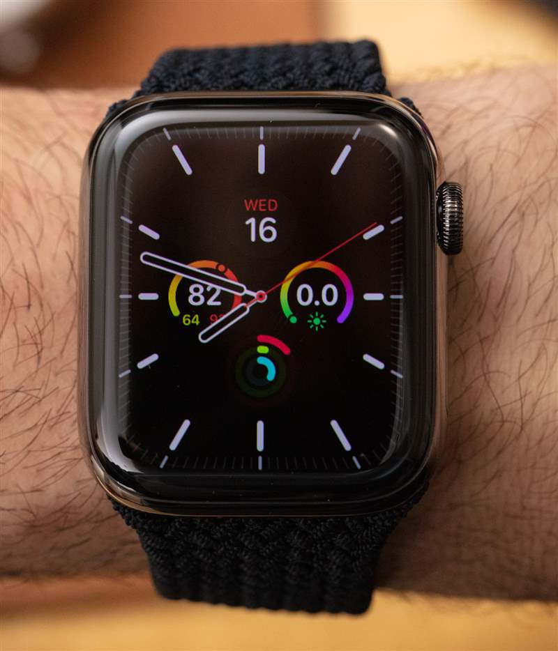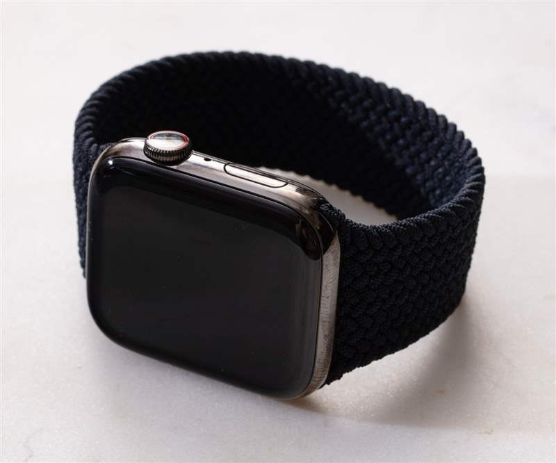 我手腕上的那個(gè)是 44 毫米長(zhǎng)的鋼制版本,帶有“石墨黑”拋光涂層。它的防水深度為 50 米,屏幕上方有藍(lán)寶石水晶,表殼后部的 LED 上方還有額外的藍(lán)寶石水晶。盡管擁有更多功能和更亮的屏幕,但電池壽命仍然“全天”。我在 Apple 新的 Braided Solo Loop 表帶上佩戴了 Series 6 鋼,這是 Apple Watch 現(xiàn)在提供的兩種新的“彈力”表帶樣式的一部分。這些讓我回到曾經(jīng)非常流行的Speidel Twist-O-Flex 肩帶我記得在 1980 年代一直看到。這些帶子不需要在手腕上調(diào)整大小或閉合;它們只是展開(kāi)以適合您的拳頭和手腕。你如何調(diào)整它們的大小?你沒(méi)有。Apple 為 Solo Loops 表帶出售一長(zhǎng)串尺寸(其中超過(guò) 10 種),因此您需要提前量好手腕才能獲得一個(gè)(或者在可能的情況下在 Apple Store 商店嘗試各種尺寸)。