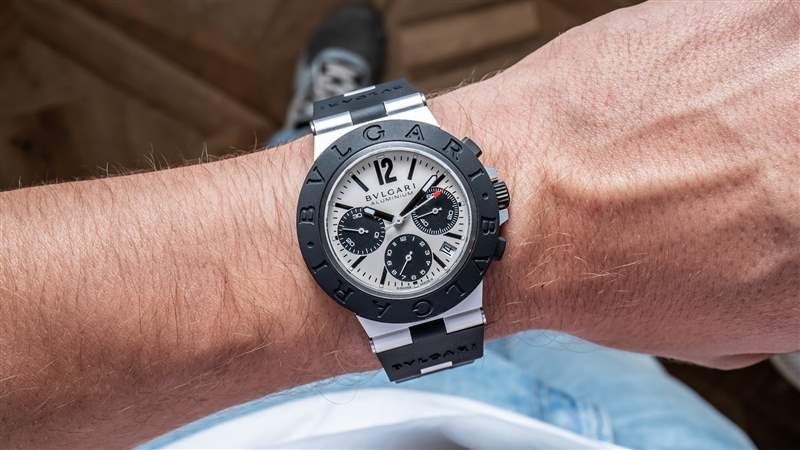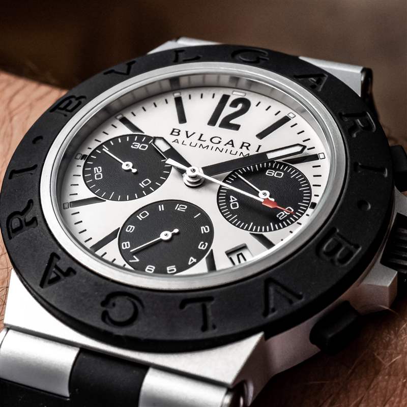 鋁的主要優點之一是它能夠注塑成型(相對容易)以及陽極氧化和呈現一系列顏色。鋁也很輕——甚至比鈦還要輕。和鈦一樣,鋁也比較軟,容易劃傷。更重要的是,鋁更容易變形,最好與“保險杠”和其他保護其免受沖擊的物理設計元素一起使用。因此,寶格麗鋁制手表采用黑色涂層保護“寶格麗寶格麗”表圈和 DLC 涂層鈦金屬底蓋。即使是橡膠表鏈上的前兩個鏈節也是涂膠鋁,以保護下面的金屬免受損壞。與鈦相比,鋁的受歡迎程度有所下降,