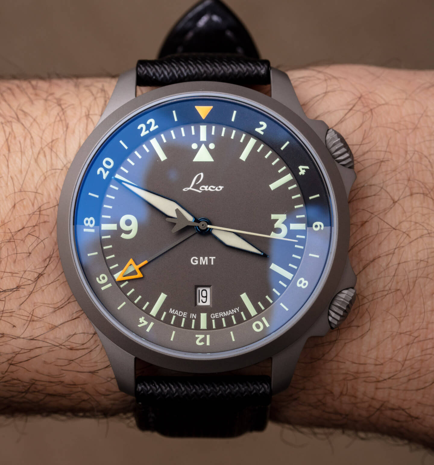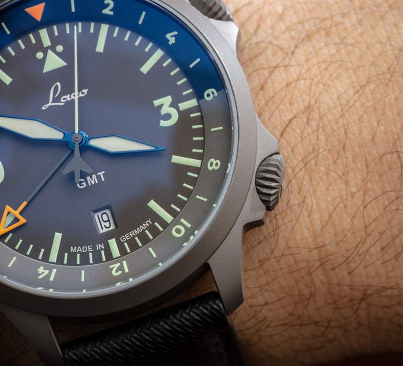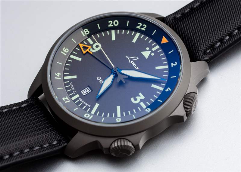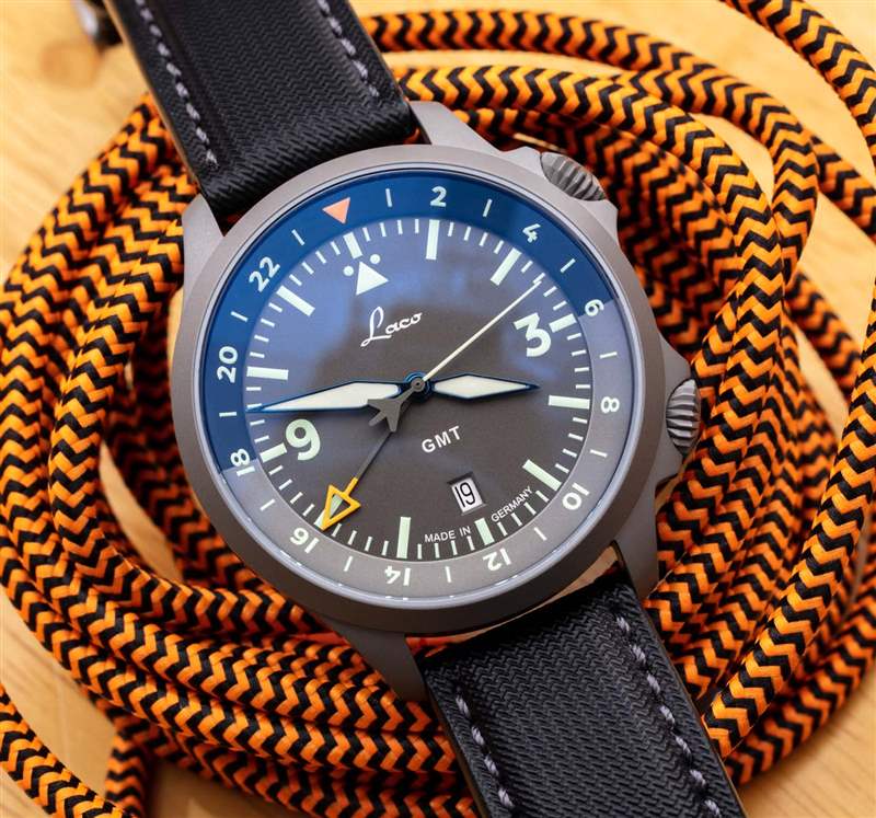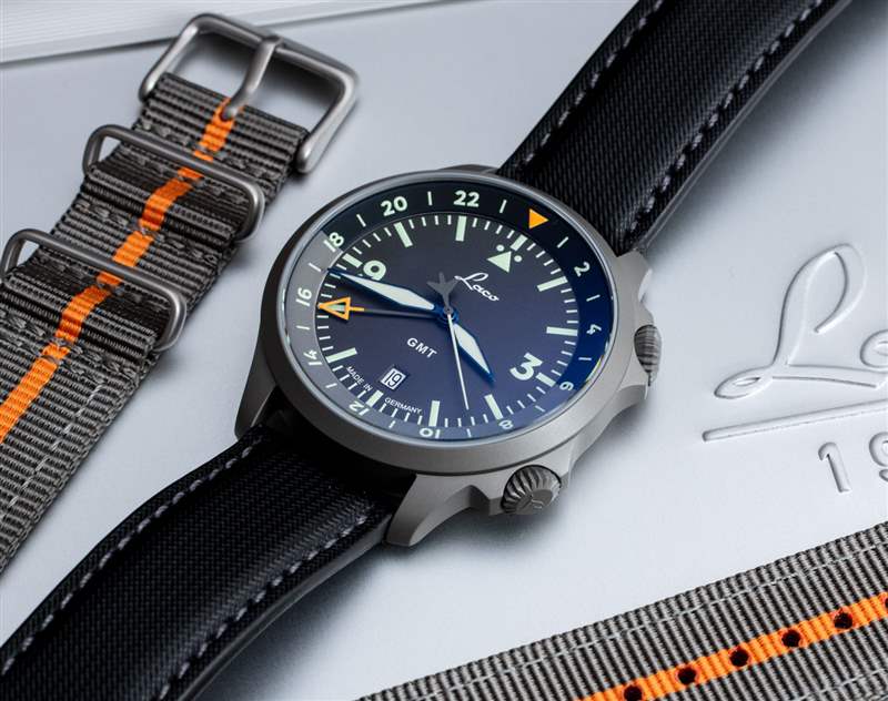 根據 Laco 的說法,無論表盤是黑色還是灰色,Frankfurt GMT 都是一款灰色調的手表,表盤上有兩種不同的橙色。否則,我們有一種暗淡的啞光灰色表面混合,給法蘭克福格林威治標準時間一種非常都市的感覺,似乎與人行道和摩天大樓很相配。當談到法蘭克福 GMT 的表盤和指針時,Laco 借鑒了其創造歷史的飛行員腕表。指針,尤其是藍色精鋼指針,是對經典德國飛行員手表最明顯的致敬。