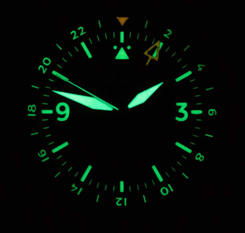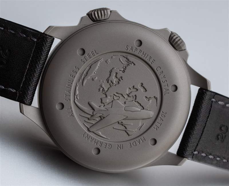 鋼制表殼防水深度達 200 米,寬 43 毫米,厚 12.5 毫米。凸耳到凸耳的距離為 50 毫米,總體而言,它佩戴起來非常舒適。我更喜歡在提供的北約風格表帶上佩戴法蘭克福格林尼治標準時間,以獲得舒適感。灰色表帶中間有一條時尚的橙色賽車帶。手表的背面是一個不錯的復古戰斗機圖案,而表盤另一側是雙圓頂和 AR 涂層藍寶石水晶。有眩光,但還不錯,法蘭克福 GMT 手表非常清晰。一個重要原因是指針尺寸和其他表盤比例正確,以及使用僅與輕微拋光的藍色指針邊緣形成對比的啞光表面。