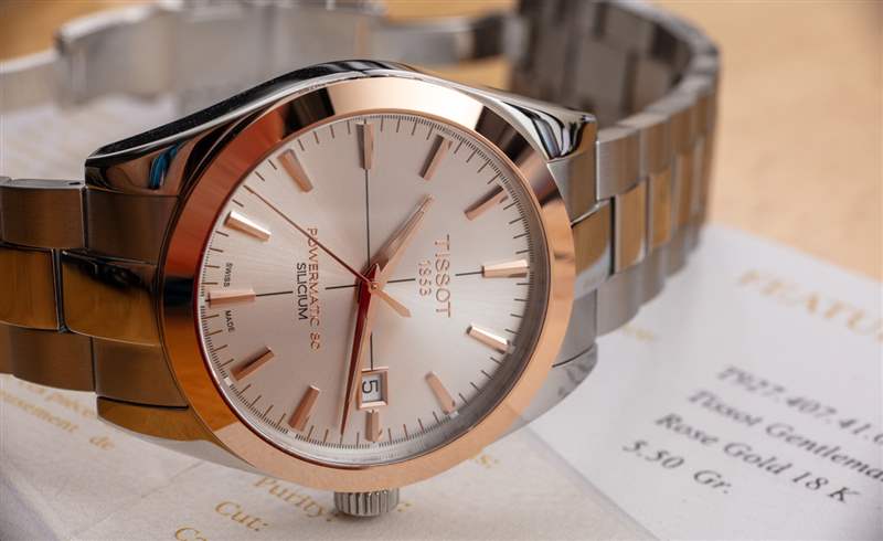 在產品組合中添加黃金很有趣,而且情緒激動。有很多像這樣的手表,其金色表圈采用 PVD ??涂層或鍍金制成。這款 Tissot Gentleman Automatic T-Gold 采用真正的 18k 玫瑰金,使產品與眾不同。它牢牢地將其置于奢侈品類別中——至少可以說,這一切的價格都是罕見的。這只表的功勞不僅僅是“這里有一些真正的黃金”。