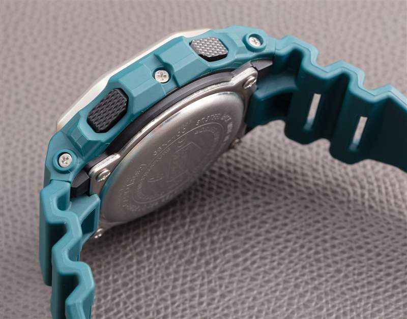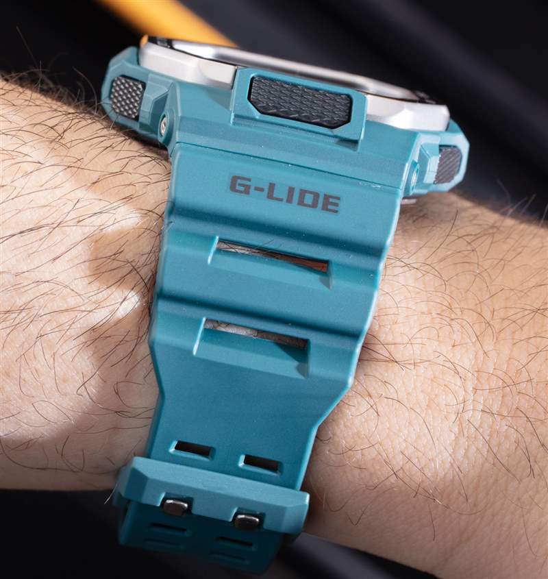 卡西歐做得非常出色,讓 G-Lide 看起來非常有吸引力。他們選擇了更加棱角分明的方形外觀,金屬邊框和令人愉悅的對(duì)稱形狀。在這里,我們有 G-Lide 參考 GBX100-2,它有一個(gè)海藍(lán)寶石色的樹脂表殼(通風(fēng)孔可以讓水從表帶和手表下方逸出),防水深度為 200 米。表殼寬 46 毫米,凸耳對(duì)凸耳 50.9 毫米,厚 14.7 毫米。它的重量?jī)H為 66 克。這實(shí)際上是現(xiàn)代 G-Shock 設(shè)備中較小的一種,盡管它有專門的海洋主題,但鑒于其實(shí)用性和美觀性,您可以輕松地日常佩戴。