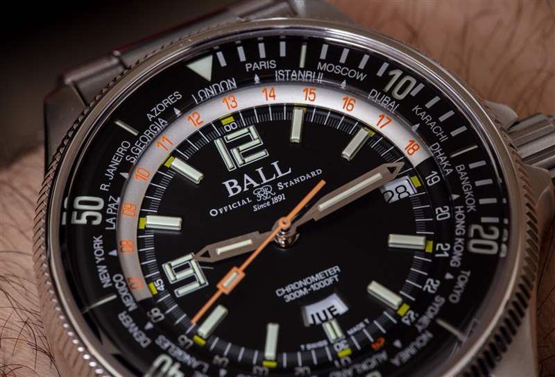 與往常一樣,Ball 充分利用了表盤指針和時標上的自發光氚氣管。在黑暗中,Engineer Master II Diver Worldtime 是一個值得一看的景象。由于世界時間手表具有外圈和內表盤的本質,與表殼的整體尺寸相比,手表上讀取時間的面感覺有點小。這沒什么大不了的,但是當您的手腕上有一塊更大尺寸的手表時,它確實需要一些時間來適應,并且用一個相對較小的表盤來讀取時間。表盤上方是一個略微圓頂的 AR 涂層藍寶石水晶鏡面。