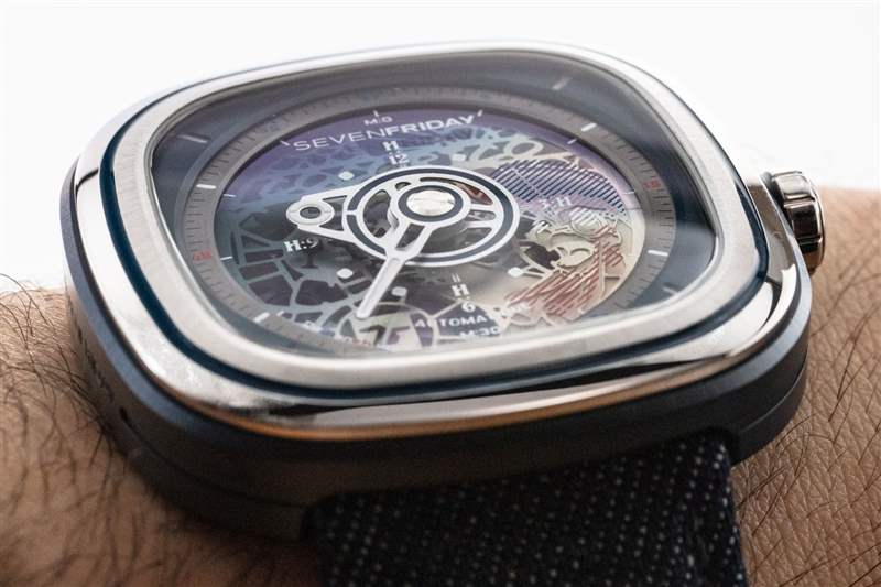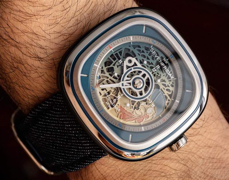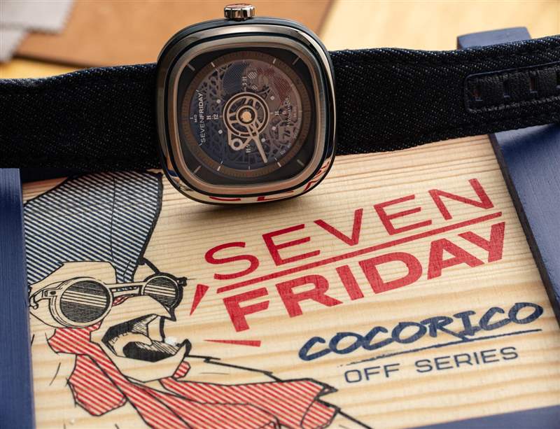 我們在 SevenFriday 產品中繼續看到的小細節使它們變得最有趣。以表帶后部的雞腳印為例。表帶本身采用紅色皮革和藍色牛仔布制成,并以特殊形狀制成,旨在與表殼相得益彰。當手表產品每個系列都有這么多定制零件時,很難抱怨價格。