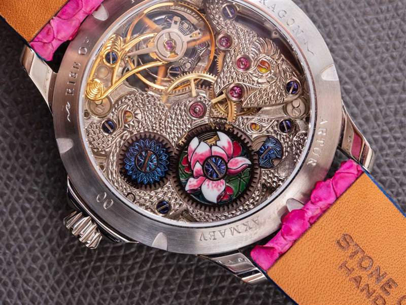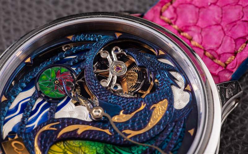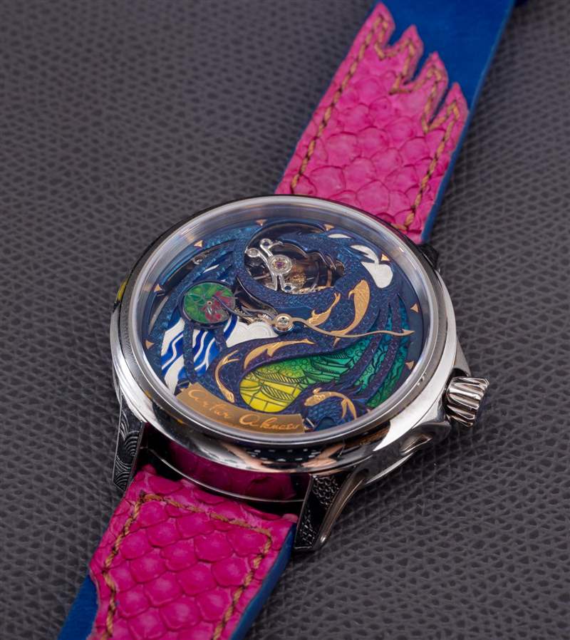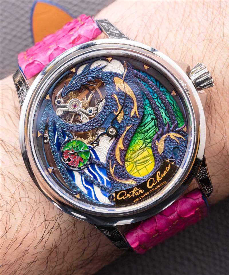 The Rise Of The Blue Dragon 腕表是 Akmaev 對遠東風格龍與現代幻想主題的藝術探索的一部分。這款手表在洛杉磯的一家名為 The Crown Collection 的藝術畫廊出售。Akmaev 特別想在表盤上強調一系列藝術技巧,并強調鮮艷的色彩。在那個追求中,我相信他成功了。精致的表盤呈現為藍色、綠色、黃色和粉色。這是使用火焰藍色金屬和微型表盤繪畫的混合物來完成的。表盤還采用了一系列手工雕刻的藝術技術,延伸到機芯以及表殼的某些部分(例如表耳)。廣告訊息廣告信息結束