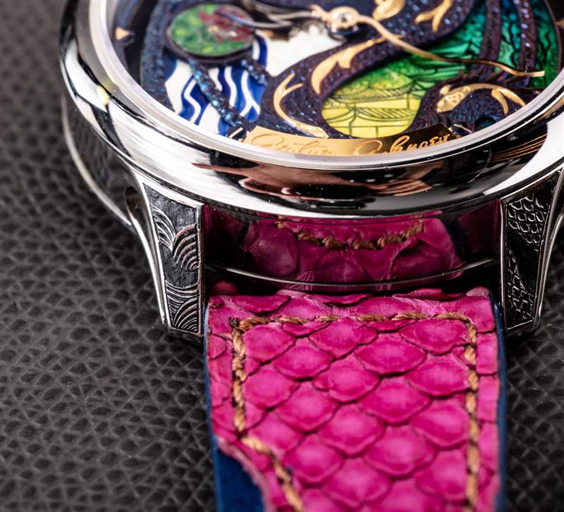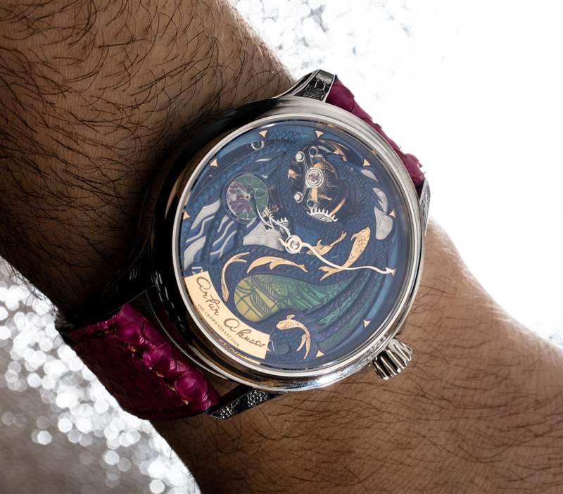 為了與色彩繽紛的 The Rise Of The Blue Dragon 表盤相得益彰,Akmaev 有一條在美國生產的定制表帶,它是藍色皮革底座,頂部縫有粉紅色的蟒蛇皮“翅膀”。當然,表帶有點華而不實(在其他華而不實的手表上),但我認為它有助于完善手表的活潑個性。以龍為主題的腕表在腕表領域并不罕見,但有趣的是龍主題是如何以如此多不同的方式表達的。我認為 Artur Akmaev 會發現足夠多的手表愛好者對他在這些非常真實的時計上手工繪制神話野獸的特殊方式感興趣。