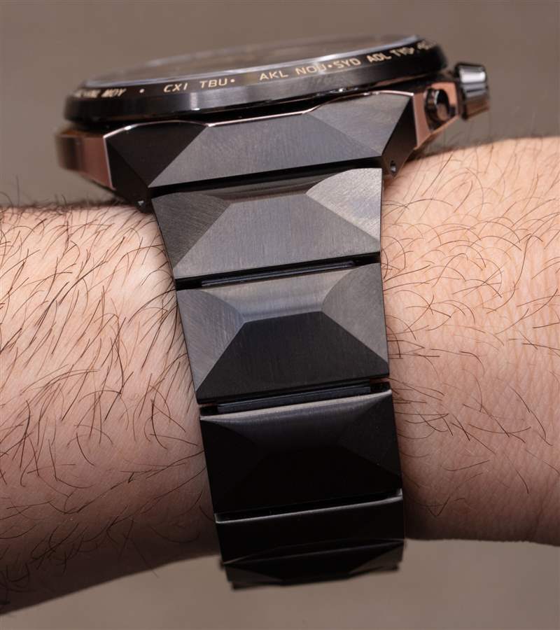 并非所有的一體式鏈式手鏈佩戴在手腕上都很舒適,但 Citizen 在這里做得很好。手鏈的內部實際上更多的是三環(huán)式,但外觀上卻是一個大致呈金字塔形的單環(huán)。一體式錐形手鏈的角度很吸引人,其獨特的設計和顏色在美學上也有點陽剛之氣。我認為這對手表來說是一個不錯的外觀,但考慮到需要加工和處理的許多單獨的鈦部件,它不可能大批量生產。