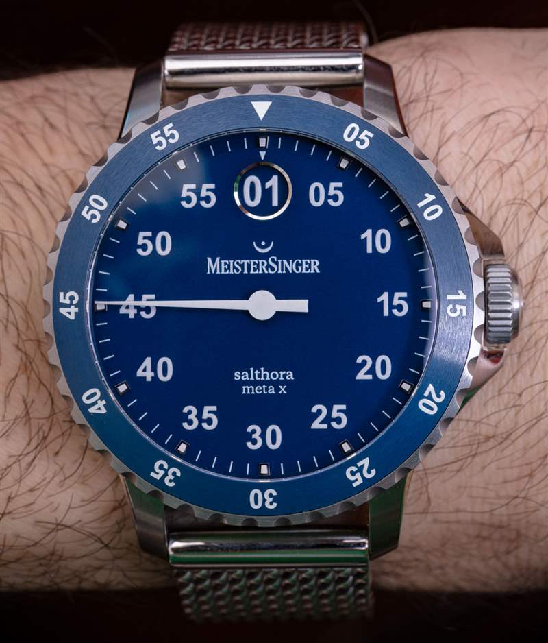 如果您還記得,MeisterSinger 是一家專門生產(chǎn)單手手表表盤的德國(guó)制表師。它的大多數(shù)手表都使用單針指示小時(shí)和分鐘。在大多數(shù)手表上,一只手每 12 小時(shí)圍繞表盤旋轉(zhuǎn)一圈。雖然 Salthora Meta X 確實(shí)有一只手,但它不像其他 MeisterSinger 手表那樣指示時(shí)間。Salthora Meta X 上較大的中央指針僅用于指示分鐘,而小時(shí)則通過(guò)位于表盤 12 點(diǎn)鐘位置的窗口“數(shù)字化”顯示在移動(dòng)的圓盤上。