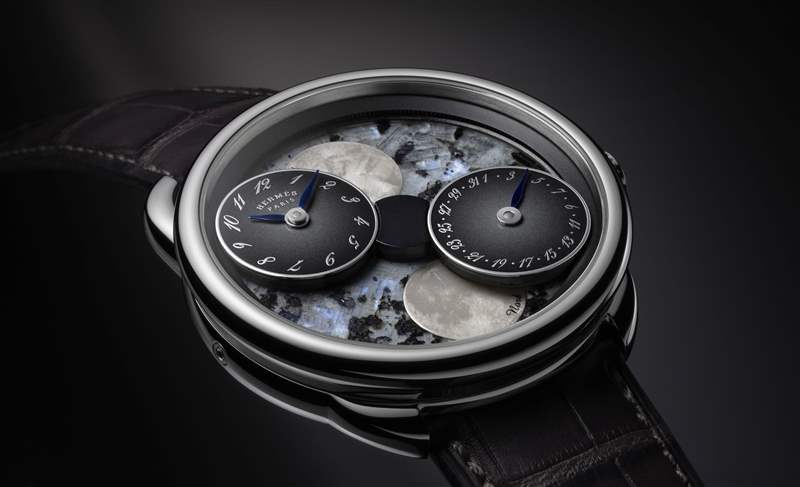 L’heure de la Lune 概念令人印象深刻的地方在于表盤的迷人對稱性和功能性。表盤背面是拋光的天然材料(此分類中有各種形式的隕石)和珍珠母貝,珍珠母貝成為月面。指示時間或日期的兩個表盤位于主表盤上方,并在其軸上每天旋轉(zhuǎn)一小圈。這是因為子表盤組件移動以阻擋月面以產(chǎn)生月相指示效果。雙月面本身并不是必需的,而是對稱的,并顯示了北半球和南半球的月相。