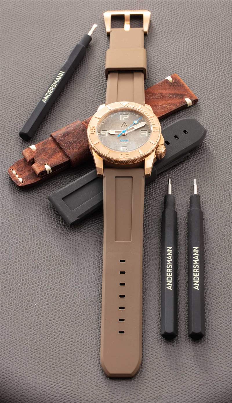 Andersmann Bronze 手表的套件中包含三種表帶選擇以及工具——這是一種受歡迎的感覺。幾年前,安德斯曼的手表有橡膠表帶,我發現它不會老化。從那以后,該品牌了解到,較新的橡膠表帶更加發燒級(盡管仍然是基本的)。安德斯曼包括一條與表盤相配的卡其色橡膠表帶,以及一條更標準的黑色橡膠表帶。套件中還包括一條做舊的皮革表帶——但對于運動或潛水任務,橡膠表帶是最好的選擇。