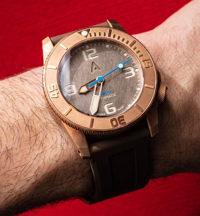 Andersmann Bronze 為品牌令人印象深刻的潛水表系列帶來時尚的金屬合金材料。Bronze 有三種形式(此處查看參考 ANN0932),表殼輪廓與 Deep Ocean 相似,但表殼更小,只有 44 毫米寬。(我評測的 Deep Ocean 是 47 毫米寬。)這篇評測中的圖片應該展示 Bronze 和 Deep Ocean 的表殼是如何相似的,但是 Bronze 的表殼更小,只有 44 毫米寬(它仍然是一塊大表),而且它具有展示底蓋(類似于 Oceanmaster II)。