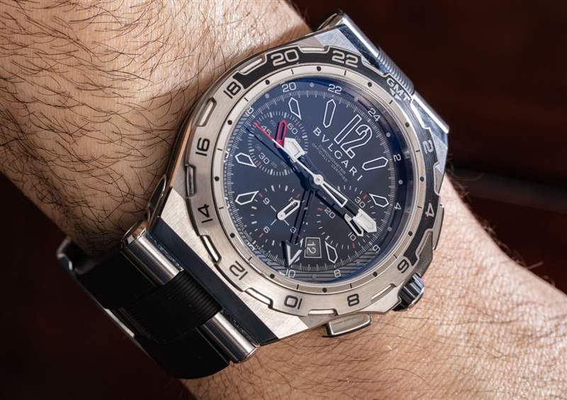 Bulgari 的大多數(shù) Diagono 手表都具有獨(dú)特的表殼設(shè)計(jì)元素,表帶和表殼之間采用門鉸鏈?zhǔn)竭B接。這個(gè)關(guān)節(jié)點(diǎn)使佩戴體驗(yàn)更加舒適,在這里表現(xiàn)得非常好。盡管有 45 毫米和大約 19 毫米厚的表殼,Diagono X-Pro 佩戴在帶有鉸接表耳的橡膠表帶上非常舒適和牢固。例如,在這里,您可以閱讀我對(duì) Bulgari Diagono Scuba 手表的 aBlogtoWatch 評(píng)論,了解鉸鏈?zhǔn)奖矶M件在 Digaono 系列手表上的正常外觀。帶有鋼制部分的定制橡膠表帶本身和不那么保守的設(shè)計(jì)是一個(gè)品味問題,但我碰巧非常喜歡它。廣告訊息廣告信息結(jié)束