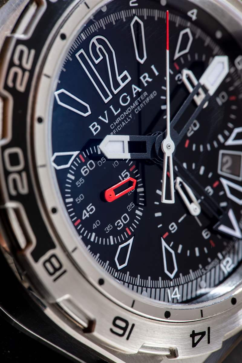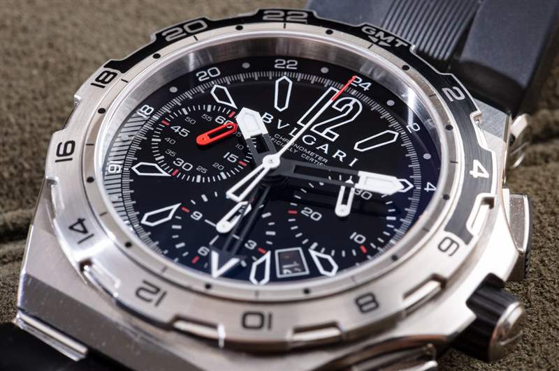 Diagono X-Pro 有一個(gè)旋轉(zhuǎn)表圈,需要一個(gè)小壓力機(jī)才能旋轉(zhuǎn)。雙向旋轉(zhuǎn)表圈采用印刷鋼制成,并帶有 GMT 指針標(biāo)記。表盤上有另一個(gè)用于 GMT 指針的刻度,因此表圈可用于跟蹤第三時(shí)區(qū)。Diagono X-Pro 我最喜歡的部分是寶格麗決定使用一塊黑色藍(lán)寶石水晶作為實(shí)際表盤材料。從那以后我就再也沒有見過寶格麗這樣做了,這意味著要實(shí)現(xiàn)它可能是一個(gè)技術(shù)難題。然而,在我個(gè)人看來,其結(jié)果是有史以來最清晰、最清晰、最整潔的運(yùn)動(dòng)手表表盤之一。