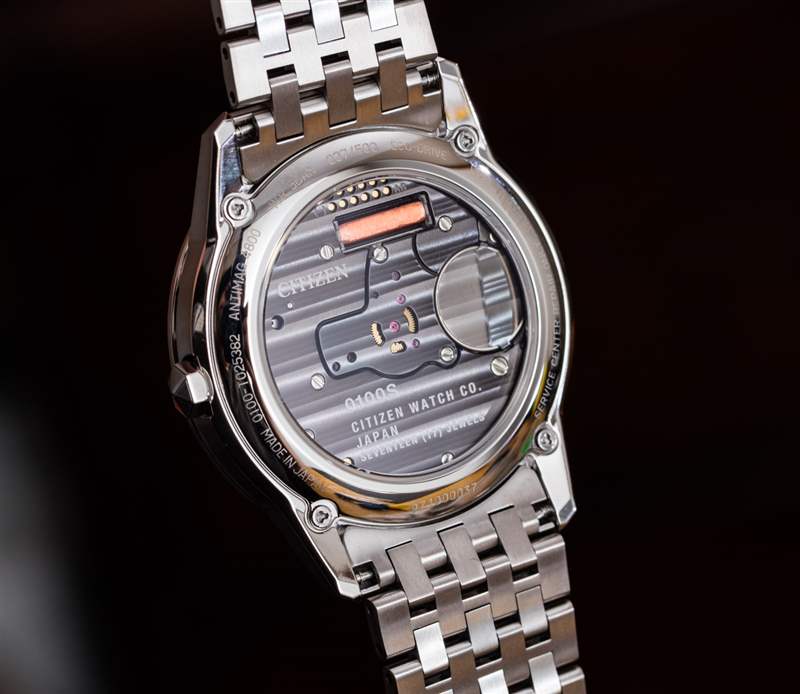 Calibre 0100 本質上類似于典型的石英機芯,但使用了類固醇。它也恰好依靠更強大的系統來解決問題,同時依靠僅通過光不斷充電的電池汲取電力。Calibre 0100 可能是所有 Citizen Eco-Drive 機芯的最大成就,因為它為高頻石英機芯提供了足夠的動力。這怎么可能對我來說是一個謎,公民可以理解地保持密切。