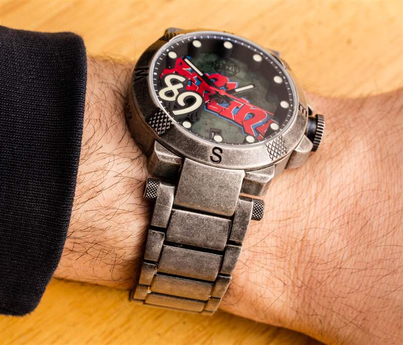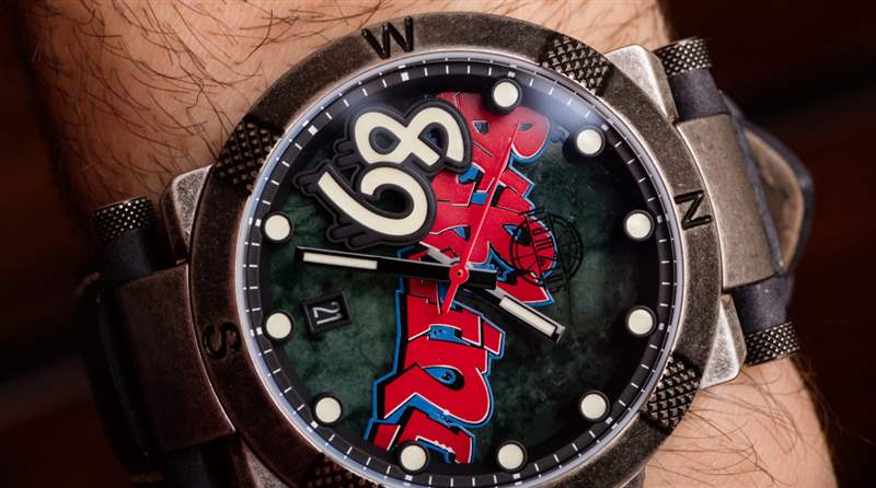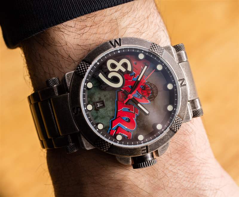 在我的手腕上是帶有“彩色表盤”的 42 毫米寬版本的柏林墻手表。特殊的“柏林”圖形靈感來自手表上的實際涂鴉(經(jīng) Pramzius 許可使用)。表盤本身是藍色的大理石石,表盤是清晰易讀的應用時標與涂鴉風格的 8 點鐘和 9 點鐘時標的混合體,它們被并置以創(chuàng)建“89”數(shù)字作為年份的標志1989年,柏林墻倒塌。考慮到表盤上的藝術,我實際上認為它整體上非常清晰易讀,指針和時標上的發(fā)光體使黑暗可見度令人印象深刻。