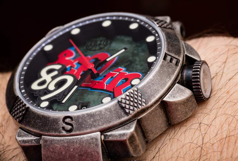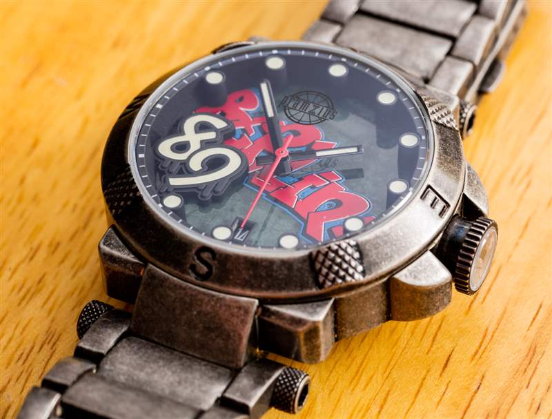 如果您去過柏林——尤其是柏林墻倒塌后的前二十年,您會立即體會到表殼和表鏈“陳舊、工業(yè)化”的外觀是如何與城市氛圍融為一體的。雖然有時表殼感覺有點像設計元素的大雜燴,但考慮到當前流行的“復古風格”(或者全新的)時計,它帶來了一種陽剛而舒適的美感。為了達到這種老化效果,100 米防水(表盤上方有藍寶石水晶)精鋼表殼和表鏈被賦予了視覺效果涂層。
