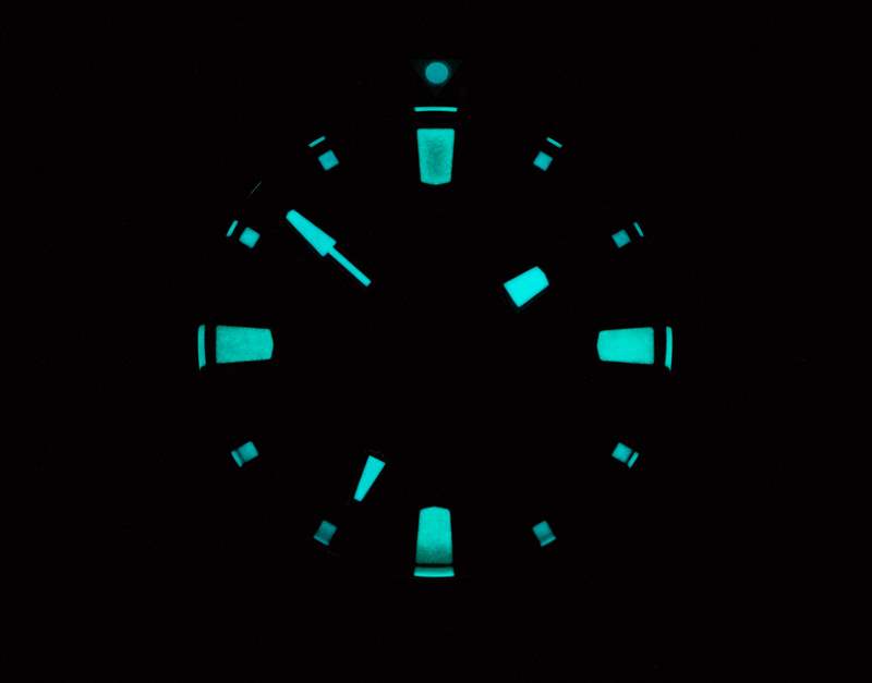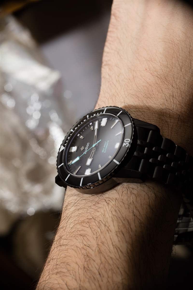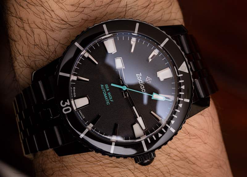 Zodiac 使用發光體和表盤顏色來創建有利于易讀性的高對比度區域。在這方面,Super Sea Wolf 53 Black 的易讀性非常高,但令我有些困擾的是,主要的 12、3、6 和 9 點鐘時標比其他時標大得多。這只是弄亂了面部的整體對稱性和平衡,這種涂黑的 Super Sea Wolf 53 Black 與其他具有相同表盤設計的 Super Sea Wolf 53 非黑色手表的對比更加強調了這一點(保存為不同的顏色)。