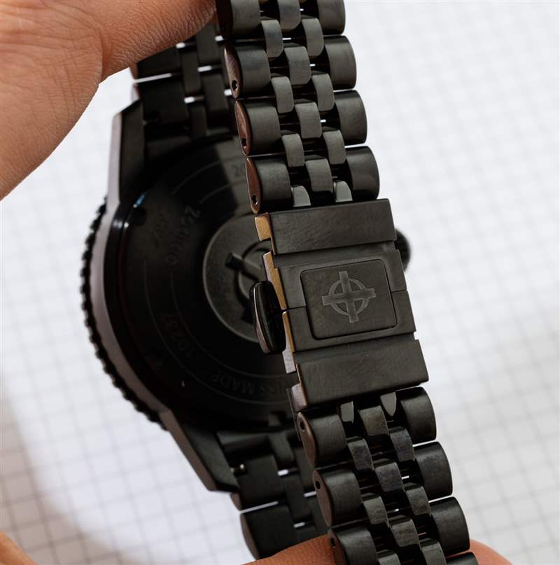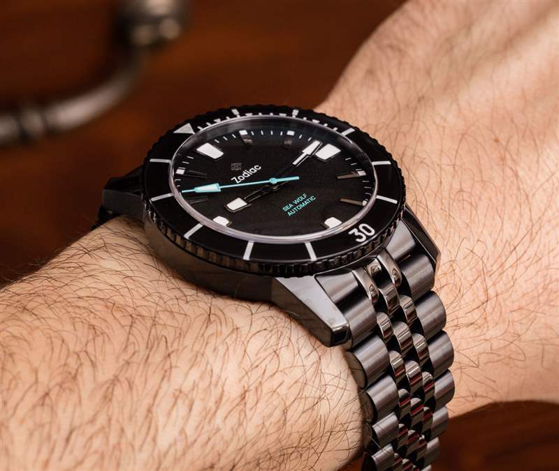 對比度很有趣,因為雖然它可以在幾乎所有情況下幫助易讀性,但太多的對比度會導致強烈的對比色……這會導致整體優雅的侵蝕。在 Super Sea Wolf 53 Black 上特別好用的是黑色 40 毫米寬的表殼和配套的表鏈。至少可以說,很難找到這樣的黑色手鏈,因為手鏈的每一塊都應該單獨涂層。我不確定 Zodiac 使用了什么工藝(因為這款手表的售價僅比非黑色款高一點),但鋼表鏈上的黑色涂層非常均勻,有助于為這款表鏈設計注入新的活力。廣告訊息廣告信息結束