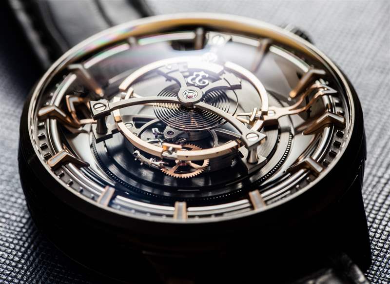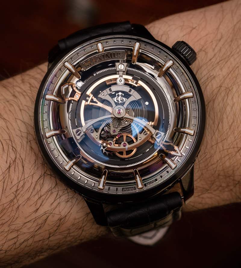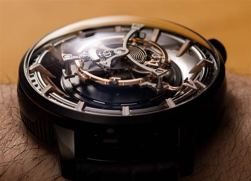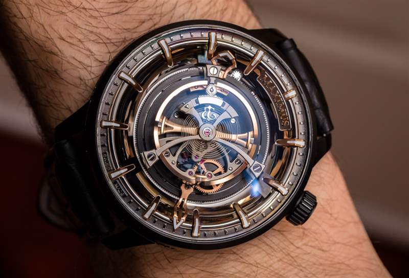 后一種說法不僅是 Maximus 49 毫米寬的表殼尺寸的功能,還因為機芯的小時鐘音量滴答聲來自為陀飛輪提供動力的高扭矩機芯的正常運行。表殼(此處為黑色涂層鈦金屬)也約 23 毫米厚,??頂部是大型 AR 涂層圓頂藍寶石水晶。盡管表殼的比例確實很大,但由于粗短的表耳和 54 毫米的表耳間距,Kerbedanz 使 Maximus 可穿戴。簡而言之,雖然這絕不是一款小巧的時計,但表殼設計確實允許大多數愿意佩戴的手腕輕松佩戴。