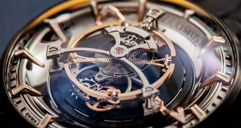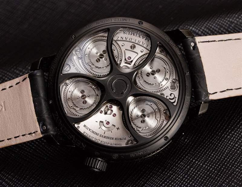 從技術上講,Maximus 手表的后部可能對我來說是最有趣的——我發現上弦機制是一種特別的樂趣,因為在轉動時發條盒齒輪的觸覺反饋和愉快的咔噠聲。只聽發條盒齒輪的咔嗒聲就足以讓您想上弦。我將它與 Ulysse Nardin Freak 中的上鏈系統進行了比較,這有點相似,因為你必須上弦才能上弦主發條。大多數 Ulysse Nardin Freak 手表的手指直接轉動單個主發條盒,因此動作或多或少是無聲的,沒有反饋。在 Maximus 中,您不是直接為一個發條盒上弦,而是控制一個同時為所有四個發條盒上弦的傳動系統,這就是您獲得良好反饋的原因。即使擁有如此強大的力量,