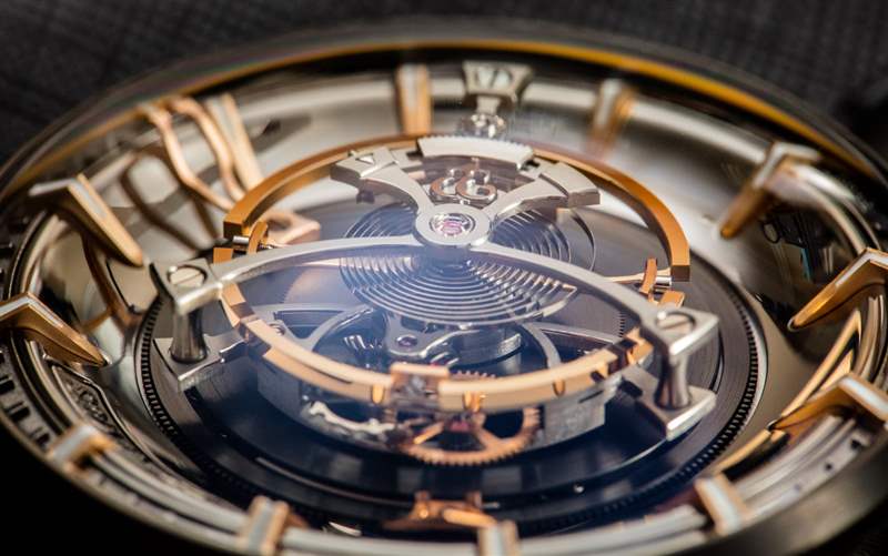 KRB-08 機芯的厚度使其能夠為如何擁有中央陀飛輪和中央安裝指針提供一個有趣的解決方案。指針安裝在凸起的陀飛輪表殼下方并向上彎曲。用戶看不到大部分指針,而是看到指針的箭頭式提示,小時和分鐘是不同的。它們遵循高度彎曲的章環,該環帶有應用的時標(此特定版本的 Maximus 為玫瑰金色)。請注意,Kerbedanz 聲稱其表盤和指針是內部生產的,并且它們是用黃金制成的。我不會認為 Maximus 是一款過于清晰的手表,但它的效果非常好。只需不使指針鏤空,就可以輕松實現更清晰的表盤。