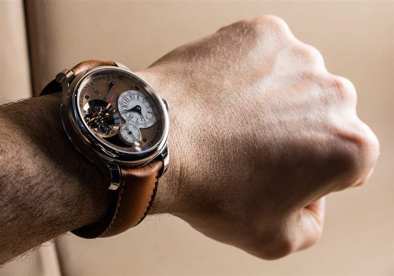 表殼、表盤和機芯的拋光和裝飾通常是一流的,整體上也是一流的。FP Journe 進一步確保其所有手表都舒適且適合日常佩戴。這里也不例外。即使是蜜棕色的小牛皮表帶,也與表盤和表殼的其他色調完美搭配,十分時尚。